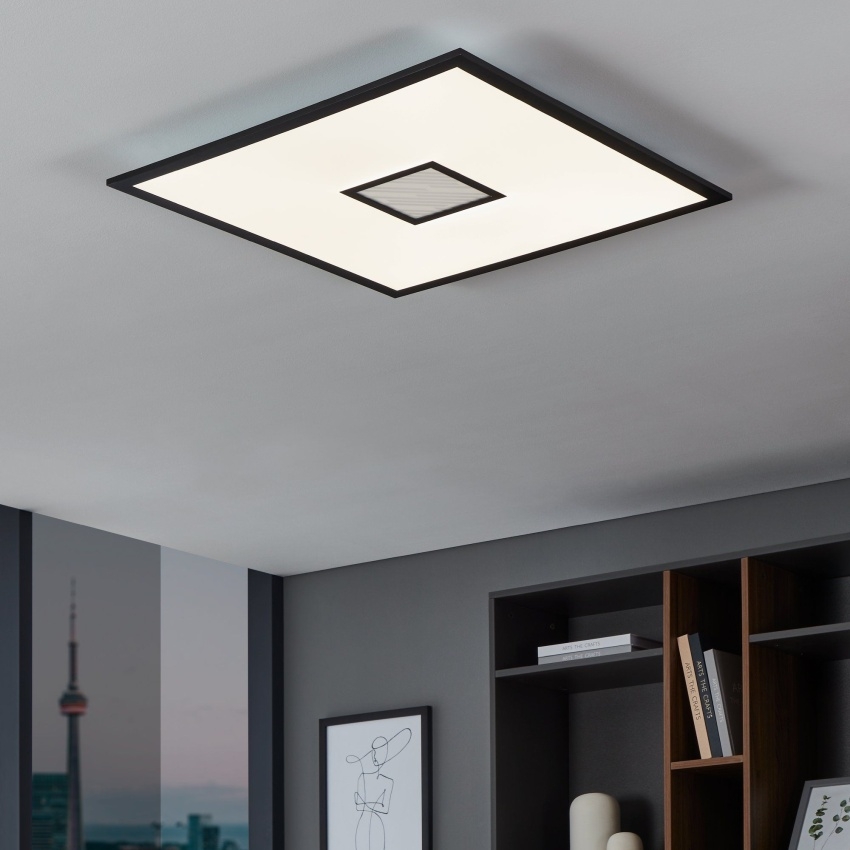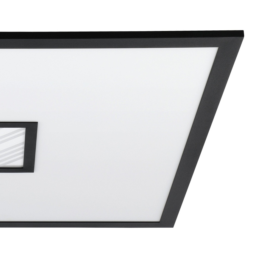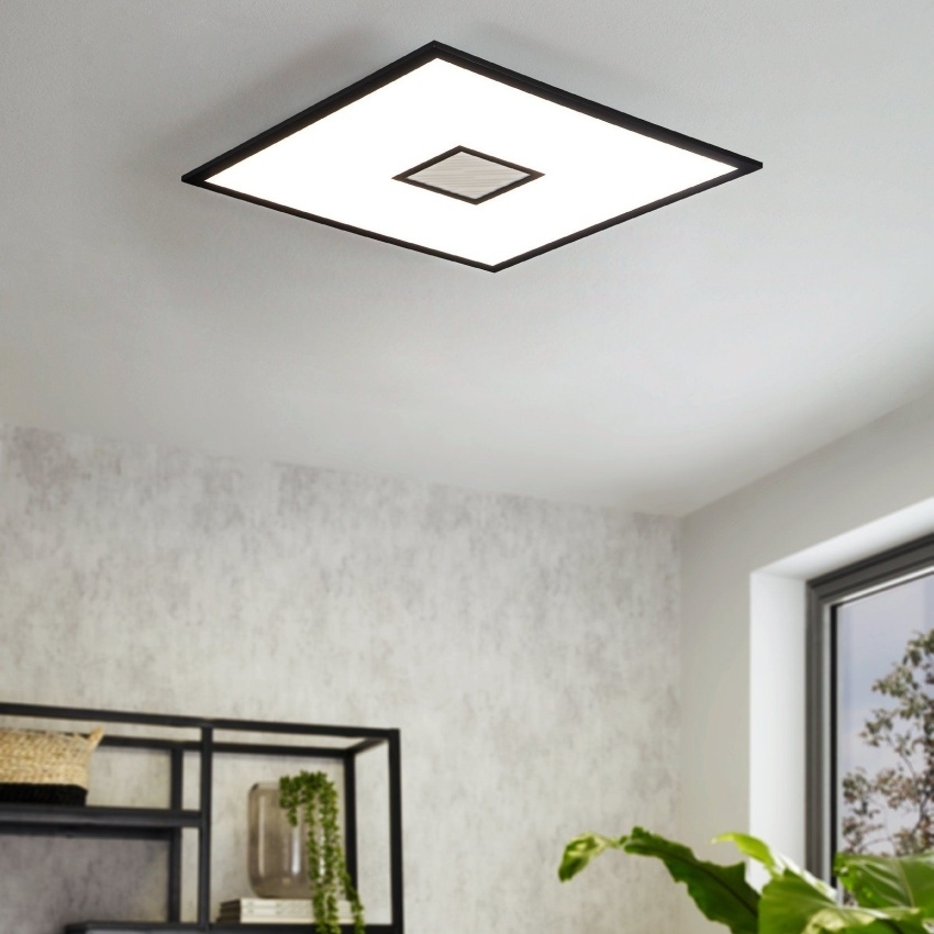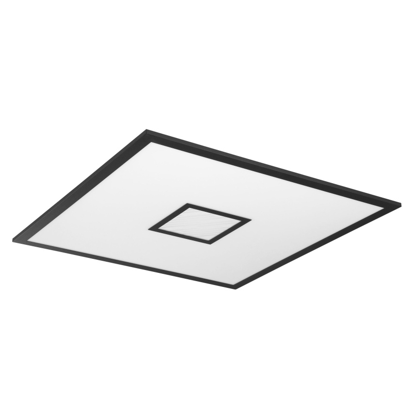 Stropní svítidlo EGLO BORDONARA 900572 je moderní LED svítidlo se čtvercovým tvarem o rozměru 60 x 60 cm. Kombinuje černý kovový rám s bílým plastovým difuzorem a ozdobnými pruhy uprostřed, které dodávají elegantní vzhled. Integrované LED diody nabízejí možnost volby mezi teplým, neutrálním a studeným bílým světlem a středová plocha umožňuje využití barev RGB. Pomocí přiloženého dálkového ovladače lze světlo stmívat, měnit barvy i nastavit ideální atmosféru. Hodí se do obývacího pokoje, ložnice, kuchyně i dětského pokoje.