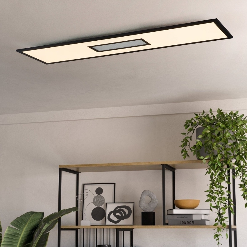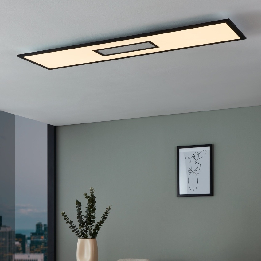 Stropní svítidlo EGLO BORDONARA 900573 je moderní LED svítidlo s obdélníkovým tvarem o rozměrech 120 × 30 cm. Kombinuje černý kovový rám s bílým plastovým difuzorem a ozdobnými pruhy uprostřed, které podtrhují elegantní vzhled. Integrované LED diody umožňují volbu mezi teplým, neutrálním a studeným bílým světlem, zatímco centrální plocha nabízí také barevné RGB světlo. Přiložený dálkový ovladač poskytuje možnost stmívání i přepínání barev. Svítidlo se hodí do moderních interiérů a nabízí efektní osvětlení pro obývací pokoj, ložnici, dětský pokoj, chodbu či kuchyni.