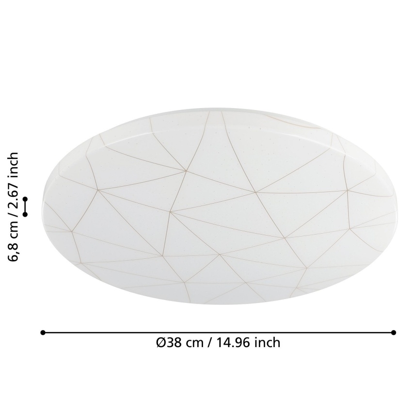 Stropní svítidlo EGLO RENDE 900612 je moderní LED osvětlení s kulatou bílou kovovou základnou a plastovým difuzorem. Kryt svítidla je zdoben jemným zlatým vzorem, který dodává svítidlu elegantní a originální vzhled. Integrované LED diody poskytují příjemné teplé bílé světlo o teplotě 3000 K a světelném toku 2300 lm. Se svým průměrem 38 cm se svítidlo hodí do moderních interiérů a je ideální volbou pro osvětlení obývacího pokoje, ložnice, kuchyně nebo chodby.