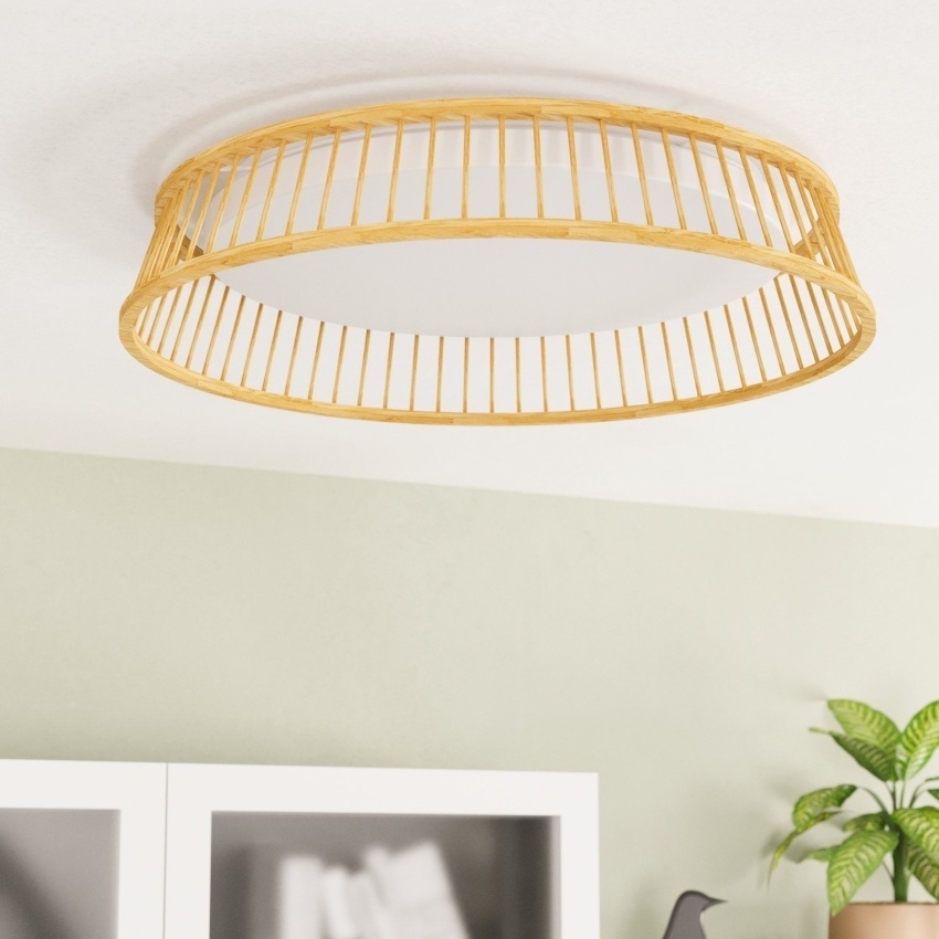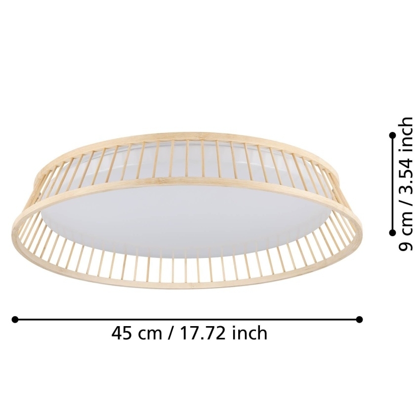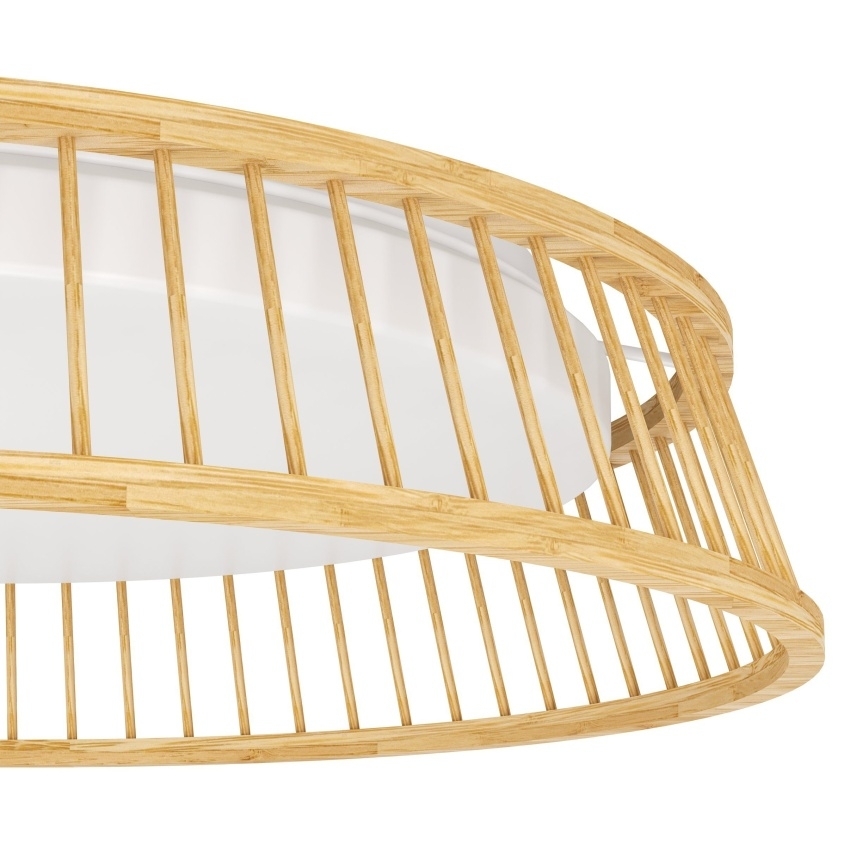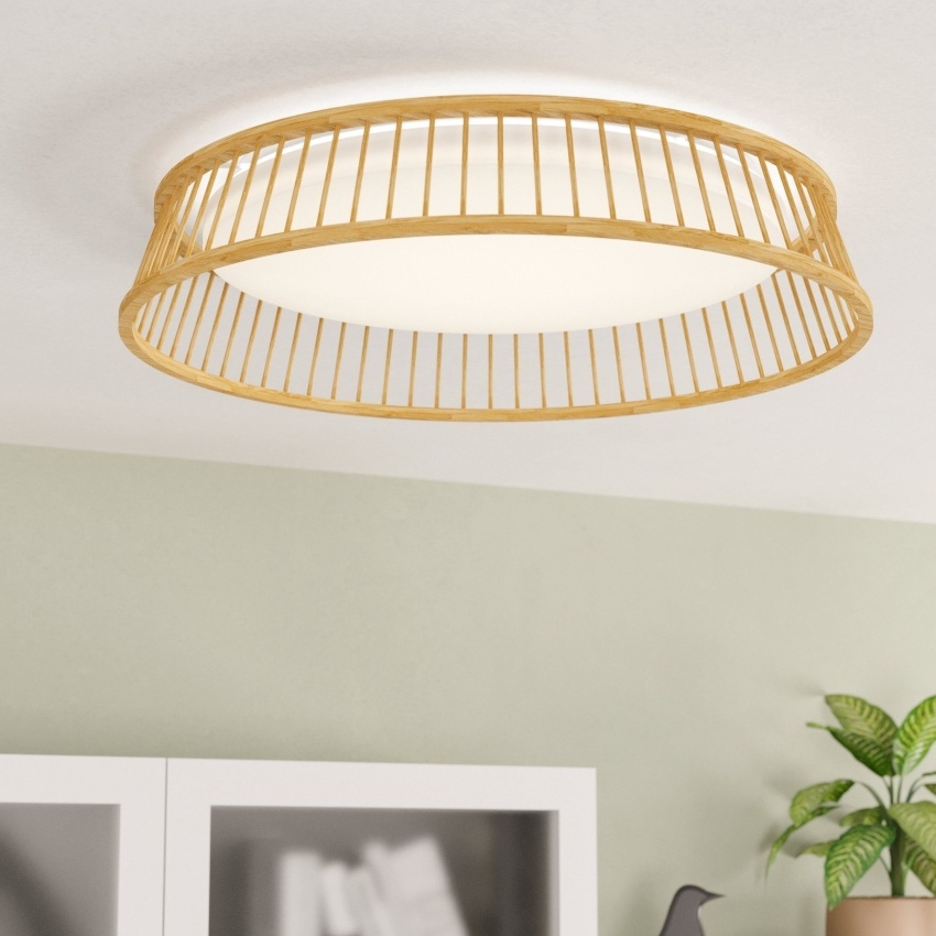 Stylové stropní LED svítidlo EGLO LUPPINERIA zaujme přírodním vzhledem a hřejivým světelným efektem. Svítidlo má kulatý bílý difuzor doplněný rámem z bambusového dekoru v přírodní hnědé barvě, který na stěnách vytváří zajímavé pruhované stíny. Integrované LED diody s teplým bílým světlem 3000 K poskytují měkké a příjemné osvětlení vhodné do obývacího pokoje, ložnice, jídelny nebo předsíně. Kombinace dřeva, oceli a plastu přináší harmonické propojení přírodních a moderních prvků. Svítidlo nabízí výkon 20 W, světelný tok 2400 lm a spolehlivý provoz s dlouhou životností bez nutnosti výměny zdroje.