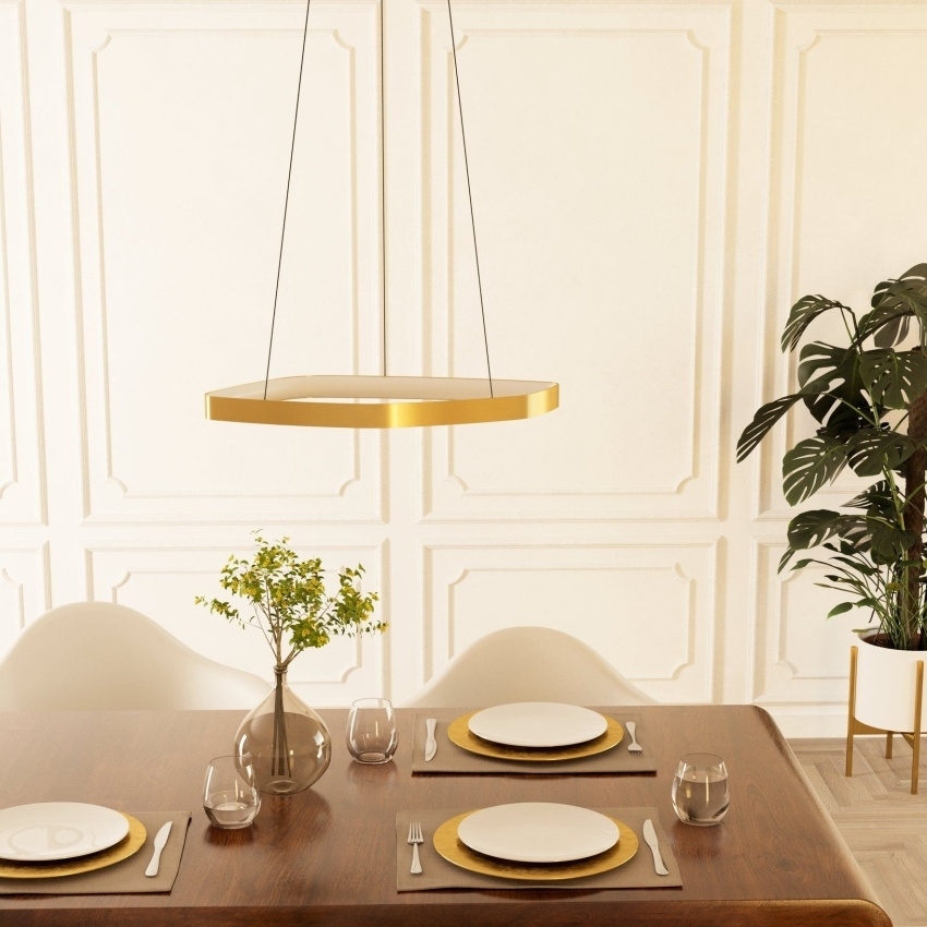 Designové závěsné svítidlo EGLO VALLEROSA 900917 v provedení kartáčovaná mosaz kombinuje luxusní vzhled s jemnými organickými liniemi. Zavěšený LED profil s bílým plastovým difuzorem vytváří elegantní a rovnoměrné osvětlení s teplým bílým světlem o teplotě 3000 K. Svítidlo je stmívatelné pomocí kompatibilního otočného nástěnného stmívače, což umožňuje snadné nastavení intenzity světla podle potřeby. Díky sofistikovanému vzhledu se perfektně hodí nad jídelní stůl, do obývacího pokoje či reprezentativních prostor moderní domácnosti.