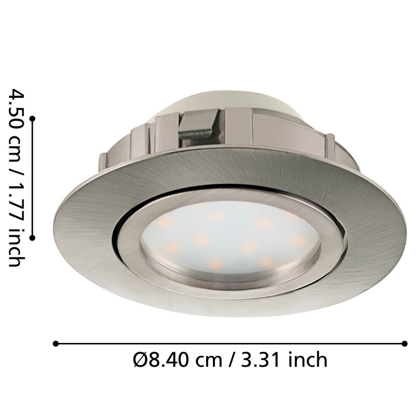Sada tří vestavných LED svítidel EGLO PINEDA 95858 v elegantním chromovém provedení nabízí moderní a funkční řešení osvětlení pro interiér. Každé svítidlo je vybaveno otočnou hlavicí, která umožňuje přesné směrování světla a vytváření individuálních světelných akcentů v místnosti. Integrované LED diody o výkonu 5,5 W poskytují příjemné teplé bílé světlo o teplotě 3000 K a celkovém světelném toku 1080 lm. Svítidla lze stmívat pomocí kompatibilního nástěnného otočného stmívače. Díky průměru 84 mm, instalační hloubce 40 mm a výřezu 72 mm jsou ideální pro vestavbu do podhledů, kuchyní, chodeb i obývacích prostor.