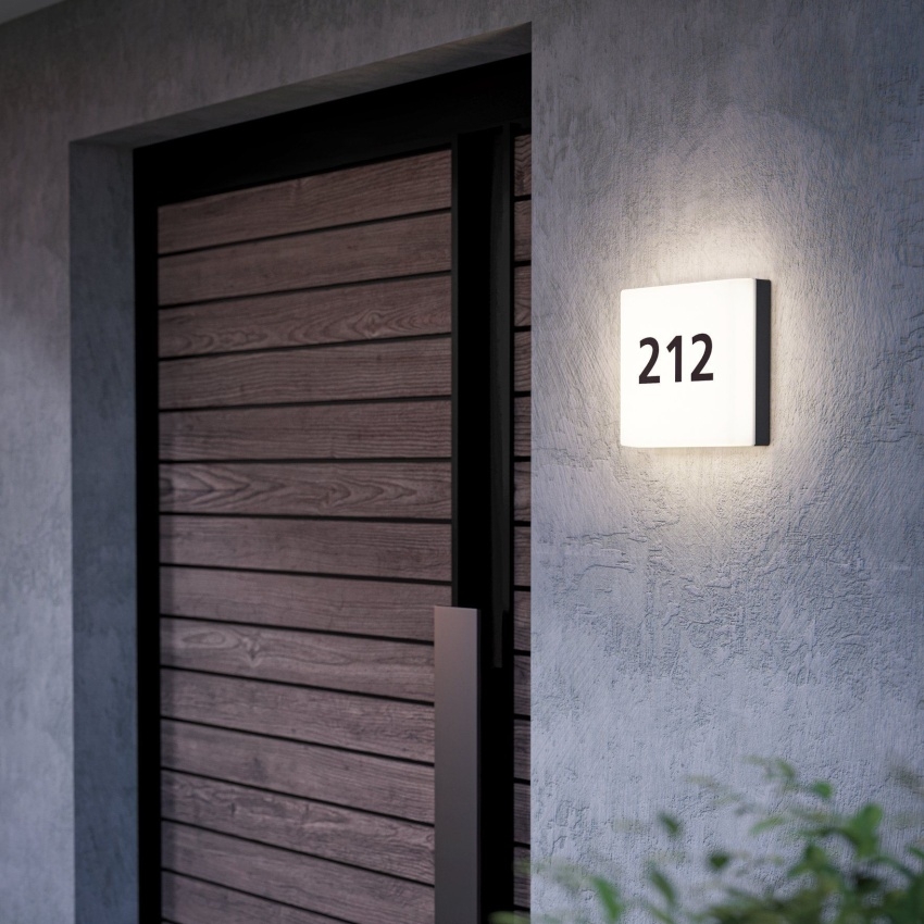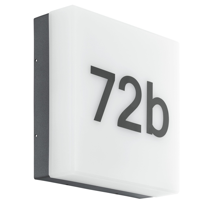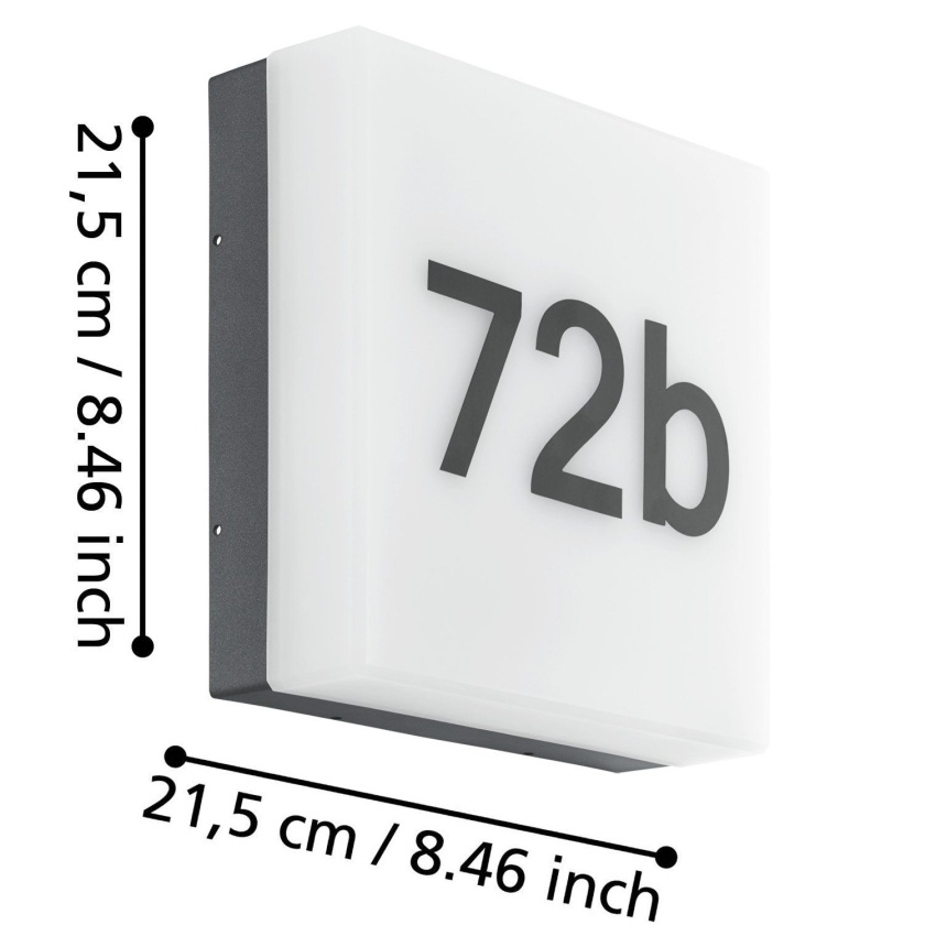 EGLO CORNALE 97289 je moderní venkovní LED svítidlo určené pro osvětlení vstupních prostor a domovních čísel. Kombinuje robustní plastové tělo v antracitové barvě s bílým difuzorem, který zajišťuje rovnoměrné rozptýlení teplého bílého světla o teplotě 3000 K a světelném toku 950 lm. Svítidlo je vybaveno funkcí Day & Night – automaticky se rozsvítí za soumraku a zhasne při rozbřesku. Součástí balení jsou samolepicí číslice (0–8, číslo 6 použitelné i jako 9) a písmena A–F v antracitovém provedení, díky nimž lze snadno vytvořit dobře viditelné domovní označení. Stupeň krytí IP44 zajišťuje odolnost proti stříkající vodě, takže svítidlo je ideální pro venkovní použití.
