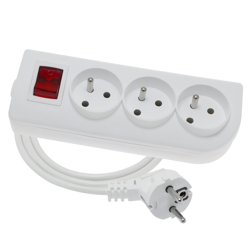 Prodlužovací přívod s vypínačem, 3x zásuvka 2p+Z, 250V, 16A, kabel H05VV-F 3x1,5mm, IP20, barva bílá, délka 2m.