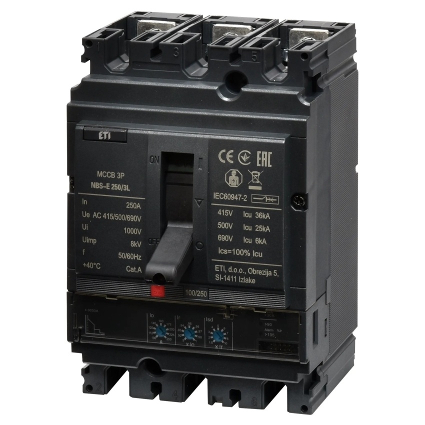 Kompaktní jistič ETI NBS-E 250/3L s jmenovitým proudem 250 A, třípólové provedení, kód 004673079.