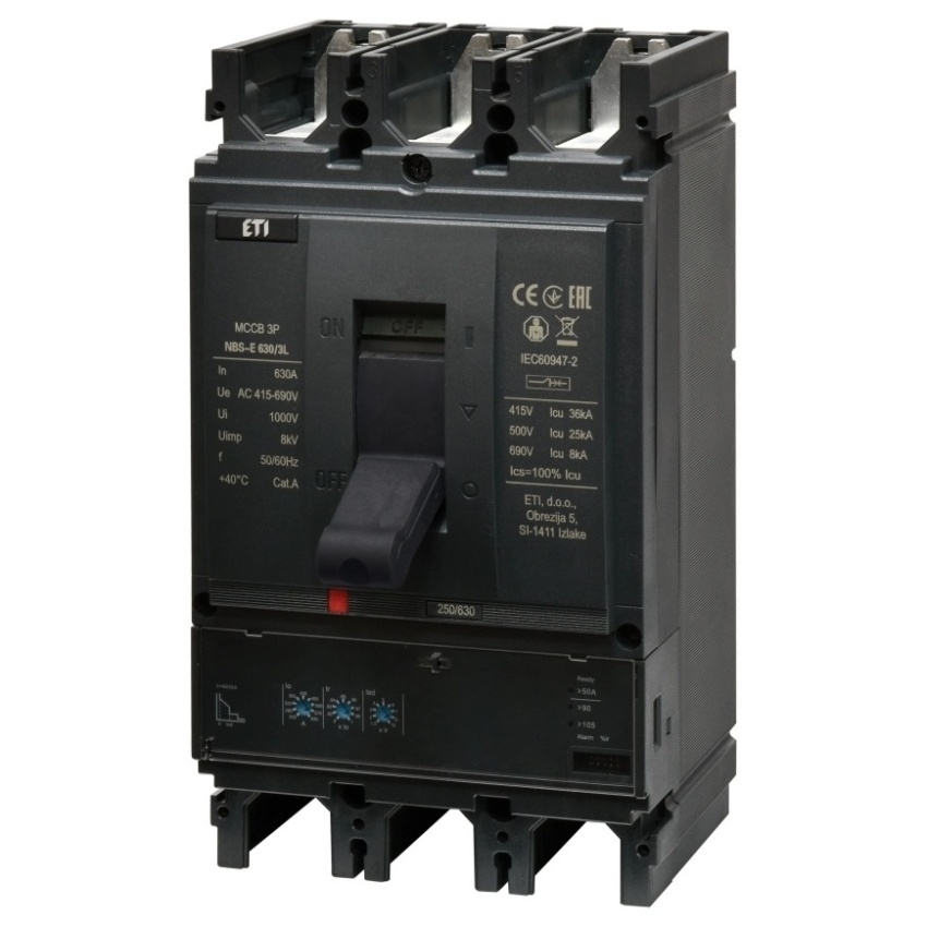 Kompaktní jistič ETI NBS-E 630/3L s jmenovitým proudem 630 A, třípólové provedení, kód 004673139.