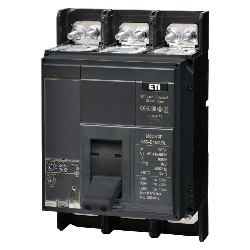 Kompaktní jistič ETI NBS-E 1600/3L s jmenovitým proudem 1000 A, třípólové provedení, kód 004673161.
