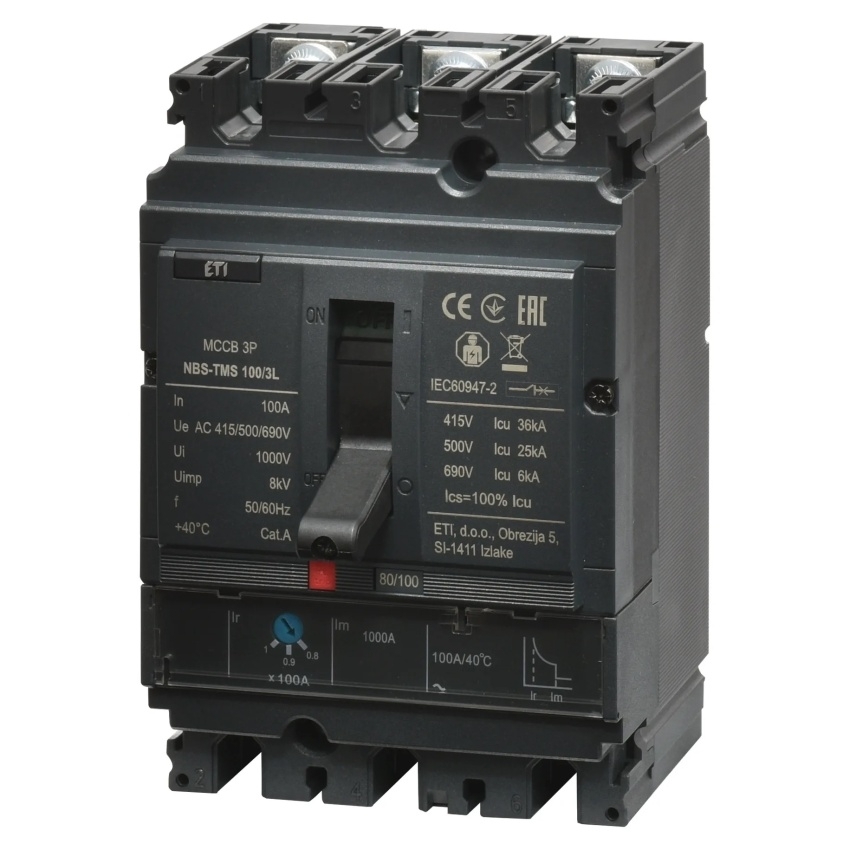 Kompaktní jistič ETI NBS-TMS 100/3L s jmenovitým proudem 100 A, třípólové provedení, kód 004673007.