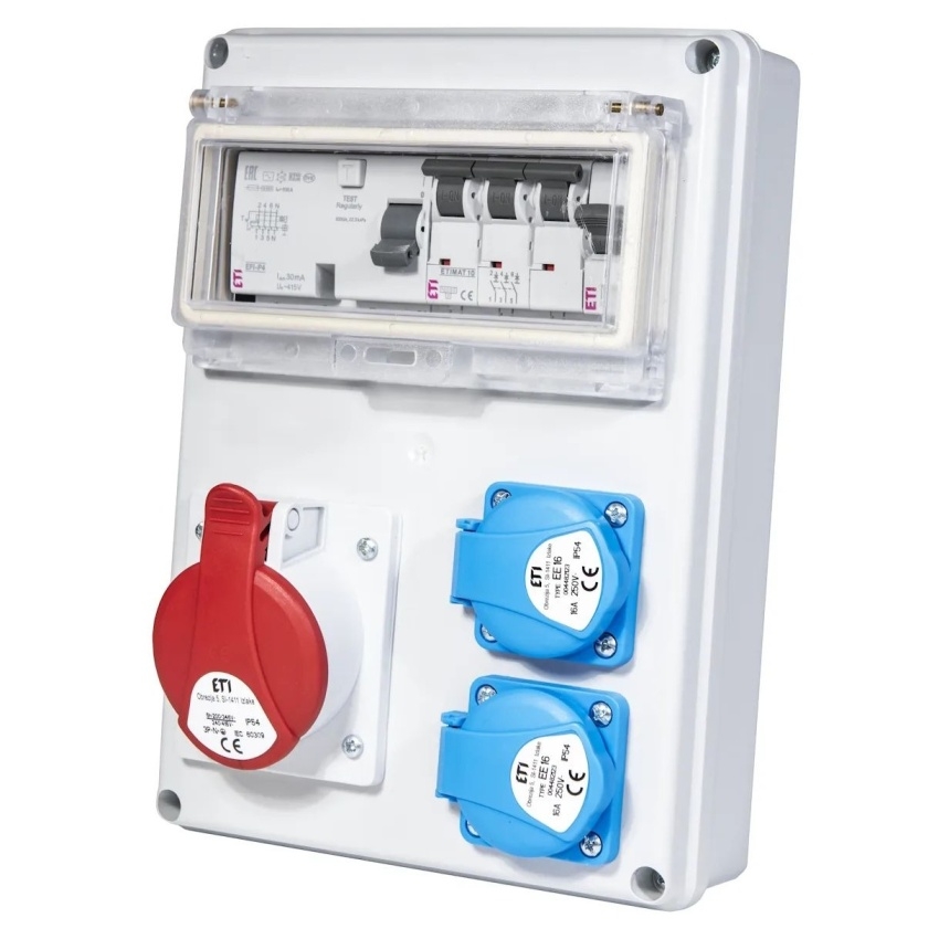 Rozvodnice ETI EDS8 RCD 2/1 32 B+C je určena pro distribuci elektrické energie v mobilních nebo pevných instalacích, kde je vyžadována zvýšená ochrana proti vlhkosti. Provedení se stupněm krytí IP44 umožňuje použití v náročnějších provozních podmínkách. Rozvodnice je vybavena proudovým chráničem a osazena jističem B16/1 a třípólovým jističem C32/3, což zajišťuje ochranu připojených obvodů proti přetížení, zkratu a poruchovým proudům.