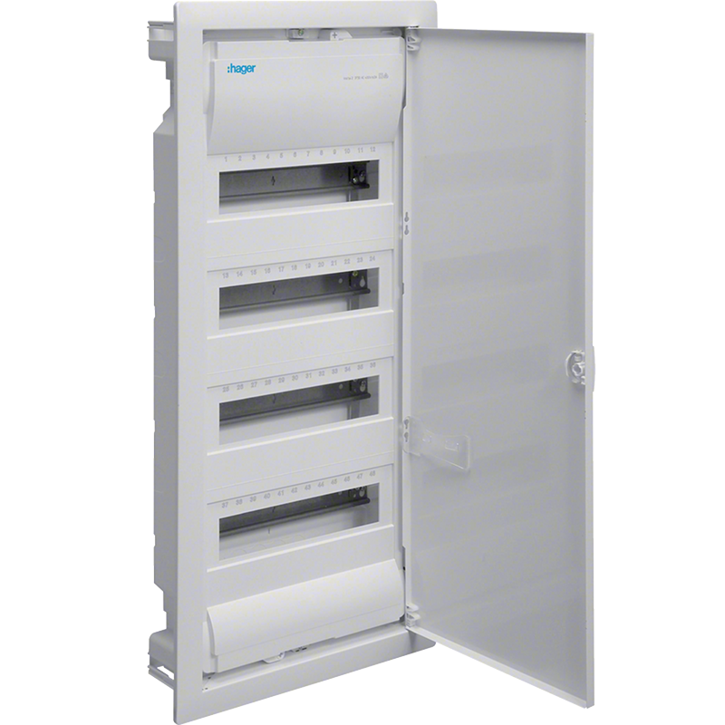 Rozvaděče jsou kompletně vybavené s bezšroubovými svorkami dle normy ČSN 332130 ed.4 Elektrické instalace nízkého napětí. Tento rozvaděč je určen pro zapuštěnou montáž do interiéru a umožňuje instalaci 48 modulů (96 půlmodulových svorek) na čtyřech lištách a ve čtyřech řadách. Je vybaven neutrální i uzemňovací svorkovnicí a vyroben z odolného plastu v bílé barvě RAL 9010 s UV stabilizací. Dvířka jsou plná, neprůhledná a bez zámku. Rozvaděč je vhodný pro jmenovitý proud 63 A a napětí 400 V, což zajišťuje spolehlivé a bezpečné rozvody. Stupeň krytí IP30 a izolační třída II zajišťují ochranu při standardních vnitřních instalacích. Díky zapuštěnému provedení a montáži pomocí šroubů je vhodný pro bytové i komerční prostory.