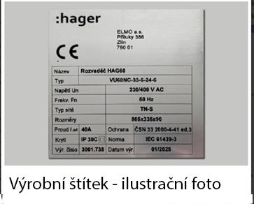 HAGER ROZVODNICE VOLTA VU48NC READY (VYDRÁTOVANÁ ROZVODNICE, VÝROBNÍ ŠTÍTEK, TECH. DOKUMENTACE)