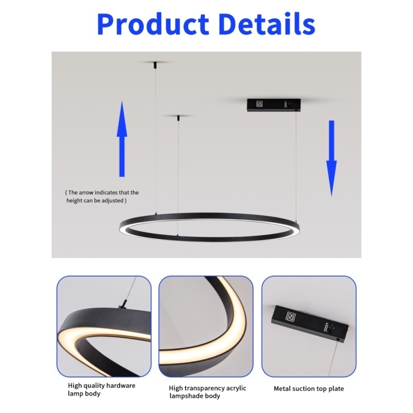 <P>Nová kolekce závěsných lustrů FINO splňuje požadavky náročného uživatele, dokonalé tenké kruhy, vysoká svítivost, designové řešení závěsného systému.. Osvětlení FINO nevyniká pouze svým designem, ale také rozmanitou funkčností. Stačí jedno kliknutí na mobilním telefonu a změníte intenzitu či tepelnou zabarvenost, kdykoliv kliknutím změníte funkčnost z cenrálního osvětlení na náladové přisvícení.<BR><STRONG>UPOZORNĚNÍ:</STRONG> Kruh svítí dolů, lustr Vás tedy nebude oslňovat jako u variant svítících dovnitř nebo do stran!!!<BR> Vzdálená správa aplikací Immax NEO PRO je pohodlná a jednoduchá.<BR>Lustr si můžete zavěsit dle vašeho přání vodorovně či šikmo a zafixovat do pozice, která Vám bude vyhovovat.<BR>Komunikující přes ZigBee 3.0, kompatibilní s iOS, Android, Amazon Alexa, Apple <SPAN lang=CS>Siri zkratky, Google Assistant, Tuya, Philips HUE, Somfy</SPAN></P> <P><STRONG>Technické parametry:</STRONG><BR>Protokol: Zigbee 3.0<BR>Materiál: kov, plast<BR>Barva svítidla: černá mat<BR>Rozměry: průměr 80cm<BR>Délka závěsu: max 120cm<BR>Barva světla: CCT 2700-6500K<BR>Příkon: 60W<BR>Světelný tok: 4200lm<BR>Stmívatelný : ano<BR>Doba svícení: 50 000 hod<BR>Vstupní napětí zdroje: (AC 220-230V 50/60Hz)<BR>CRI(Ra) Index podání barev: <86 (denní světlo má hodnotu Ra 100)<BR>Záruční lhůta: 3 roky</P> <P><STRONG>Konečná úprava výšky závěsného lustru.</STRONG><BR>Nejprve závěsný lustr naistalujte na strop dle pokynů v přiloženém manuálu. <BR>Pro konečné nastavení výšky svítidla stačí upravit délku závěsných lanek.<BR>Zkrácení délky lanka: <BR>1. uvolněte pojistku umístěnou na horním okraji lanka (u základny svítidla), zamáčknutím dovnitř do těla základny a poté <BR>2. po té lanka pomalu posunujte nahoru směrem do základny svítidla. Lanko zůstane zafixováno ve Vámi zvolené pozici.<BR>3. Takto postupně upravte všechna lanka.<BR>Prodloužení délky lanka: pokud jste zasunuli lanko příliš, musíte jej nejdříve uvolnit deaktivací pojistky (opět zamáčknutím jistícího kroužku dovnitř základny svítidla). Tím umožníte povolení lanka a následně úpravu do Vámi zvolené pozice. <BR>Takto postupně upravte všechna lanka.<BR>Nikdy netahejte lanka násilím, bez deaktivace pojistky! Při takové manipulaci dochází k mechanickému poškození.<BR>Děkujeme za pochopení</P>