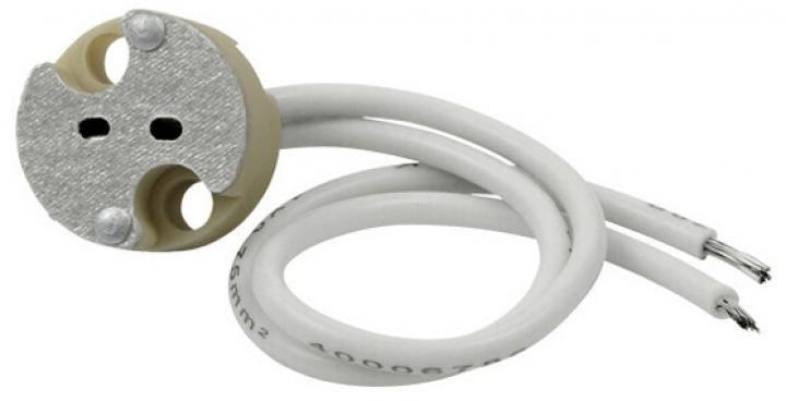 Keramická objímka pro světelné zdroje s paticí G4-GY6,35, maximální napětí 24 V, jmenovitý proud 5 A.