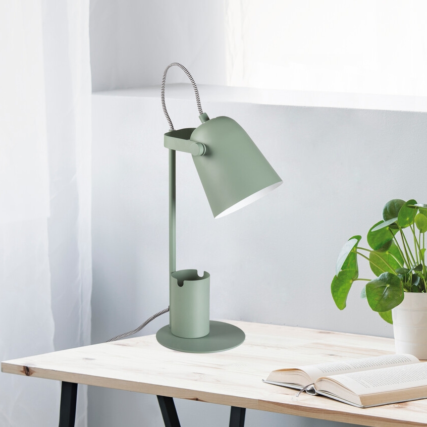 Kancelářská stolní lampa RAIBO E27 - Kanlux RAIBO je módní retro stolní lampa. Je k dispozici ve 4 pastelových barvách a také v oblíbené černé a bílé. V základně je zabudovaný organizér s úchytem, do kterého můžete vložit telefon, pera nebo brýle. Velké stínidlo, do kterého lze namontovat žárovku s paticí E27, má široký rozptyl světla. Je zde vidět retro vliv, ale také smysl pro detail a solidní zpracování (ocel). Pozornost jsme věnovali i spodní straně lampy a přidali jsme pěnovou podložku, aby lampa nepoškrábala stůl.