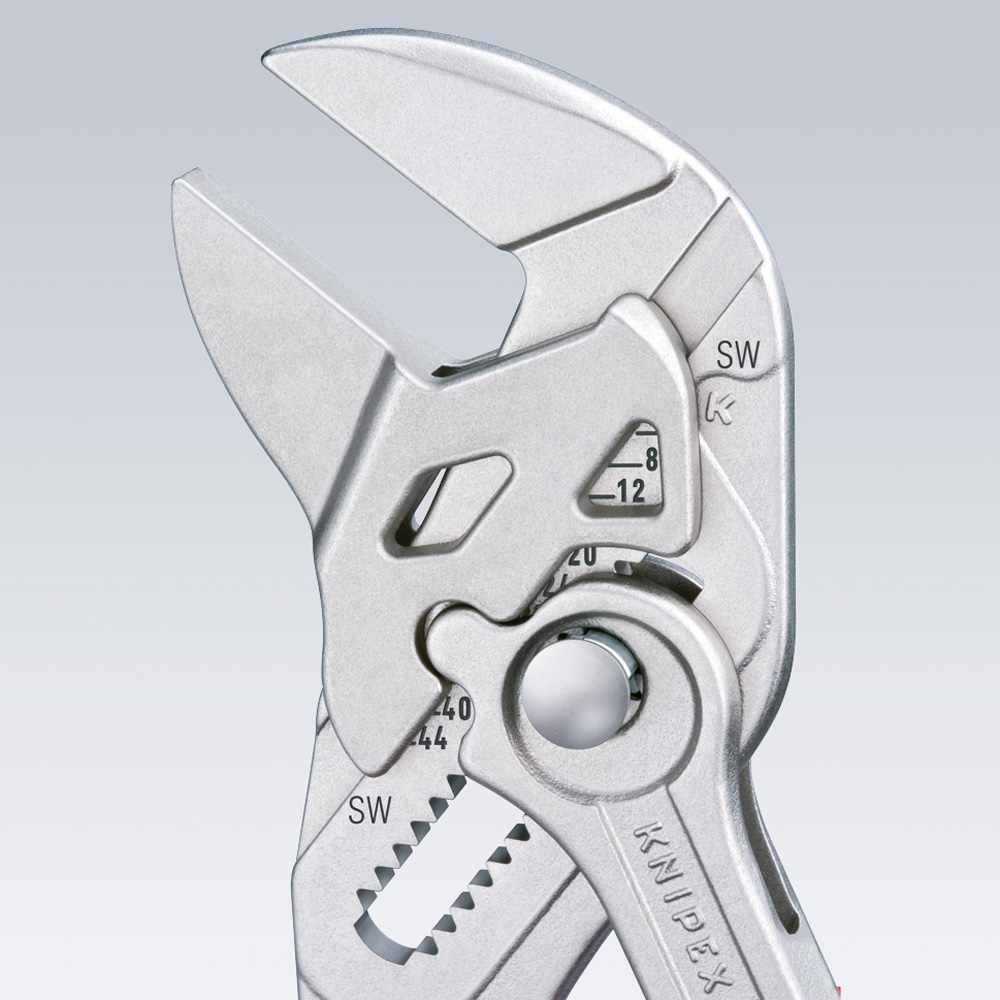 Kleště a klíč v jediném nástroji. Výborně se hodí k uchopování, držení, stlačování a ohýbání obrobků. Nedochází k poškození hran u citlivých, měkkých šroubů (Cu) v důsledku dosednutí bez vůle po celé ploše. Se škálou k nastavení rozsahu rozevření mimo dílec. Žádné neúmyslné přenastavení čelistí a žádné proklouznutí kloubu. Plynulé nastavení všech velikostí klíčů až do uvedené kapacity pomocí paralelně vedených čelistí