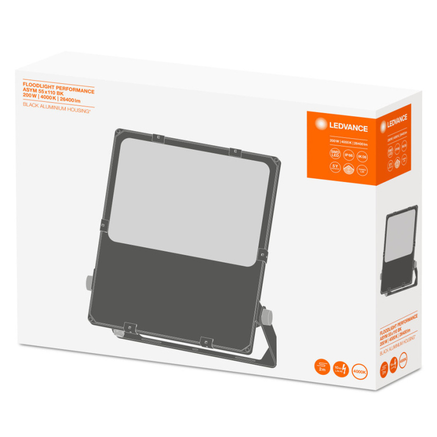 Floodlight s širokým vyzařovacím úhlem, asymetrické vyzařování pro různé druhy použití. Vlastnosti produktu: Vysoká světelná účinnost: až 140 lm/W. Asymetrické vyzařování pro různé oblasti použití. Montáž pod úhlem (45°) a náklon až 180°. Stupeň krytí: IP66. Odolnost proti nárazu: IK08. Okolní teplota při provozu: –30…+50 °C. Vysoká ochrana proti přepětí: až 10 kV (L/N-PE), 6 kV (L-N). Integrovaný odvzdušňovací otvor zabraňující vzniku kondenzace uvnitř svítidla. Připojení prostřednictvím 2m kabelu, nutná elektroinstalace. Výhody produktu: Úspora energie až 90 % ve srovnání s halogenovými reflektory. Úspora energie až 45 % v porovnání se svítidly s tradičními výbojkami. Jasné, robustní a odolné. Rovnoměrný rozptyl světla a minimální oslnění. Nulová hodnota horní účinnosti svítidla (ULOR 0 %) při montáži v náklonu 0°. Montážní otvor pro snadnost instalace. 5letá záruka. Druh použití: Přímá náhrada za svítidla používající HID světelné zdroje. Venkovní použití (IP66). Veřejné prostory. Průmysl. Sportovní zařízení. Architektonické osvětlení. D-značky podle EN 60598-2-24 pro komerční jednotky s nebezpečím požáru, např. kvůli hromadění prachu.