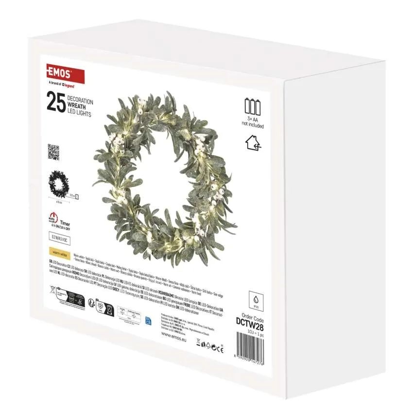 LED dekorativní věnec EMOS DCTW28 je určen pro vnitřní použití a nabízí teplé bílé světlo. Věnec má průměr 35 cm a obsahuje 25 LED diod. Napájení je řešeno pomocí 3× AA baterií (nejsou součástí balení). Součástí je také časovač umožňující automatický provoz v režimu 6 h zapnuto / 18 h vypnuto. Krytí IP20 odpovídá použití v interiéru.