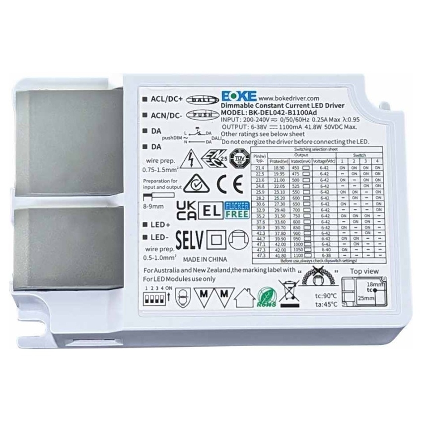 DRIVER DALI 42W 1100mA ADJ – LED driver DALI - LED předřadník BOKE je určen k ovládání svítidel pomocí DALI (Digital Addressable Lighting Interface) systému. Oboustranná komunikace bez omezení umožňuje špičkové, inteligentní řízení osvětlení.