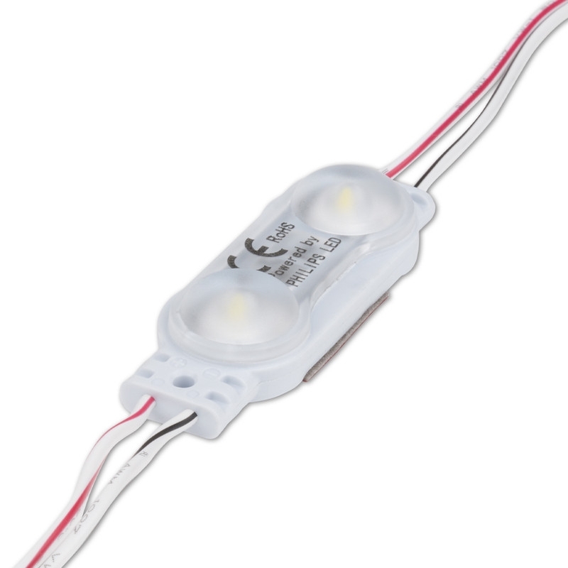 LED modul 2B5 0,72 W, 12 V, 2x LED, IP66, 6500 K-studená bílá, světelný tok 110lm, vyzařovací úhel 170 °, Ra>75, životnost až 30.000 h+, rozměry 52x18,5x9,6 mm, materiál plast, stmívatelné. Jednostranně až 30 ks.