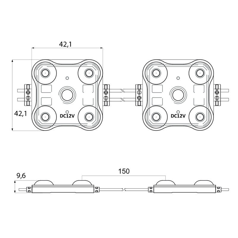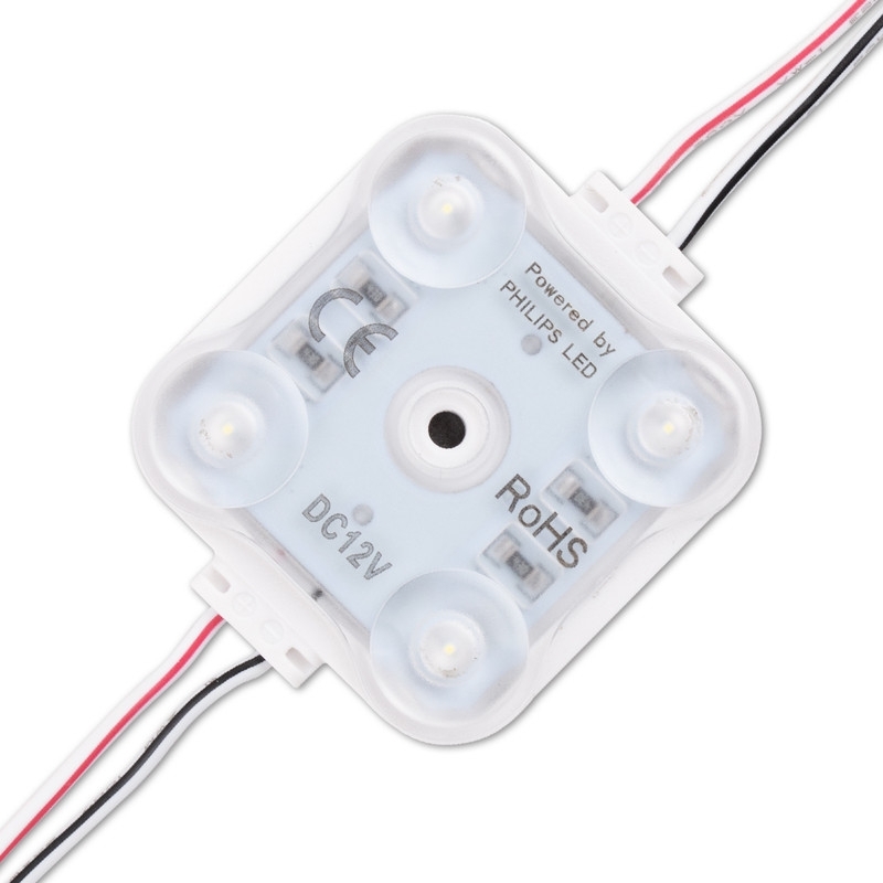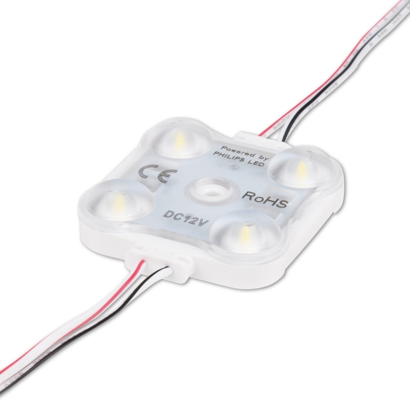 Tento LED modul obsahuje čtyři LED čipy typu SMD 2835 s celkovým výkonem 1,2 W a je určen pro napájení konstantním napětím 12 V DC. Poskytuje světelný tok 180 lm a studenou bílou barvu světla s teplotou chromatičnosti 6500 K. Modul nabízí velmi široký vyzařovací úhel 170° a dosahuje účinnosti až 150 lm/W. Konstrukce je vyrobena z plastu, splňuje stupeň krytí IP66 a je vhodná pro použití v náročnějších podmínkách. Jednotlivé moduly mají rozměry 42,1 × 42,1 × 9,6 mm a jsou propojeny vodiči se středovou roztečí 200 mm. Modul je stmívatelný a při jednostranném napájení lze zapojit až 20 kusů v sérii. Instalace je usnadněna montážním otvorem a oboustrannou lepicí fólií.
