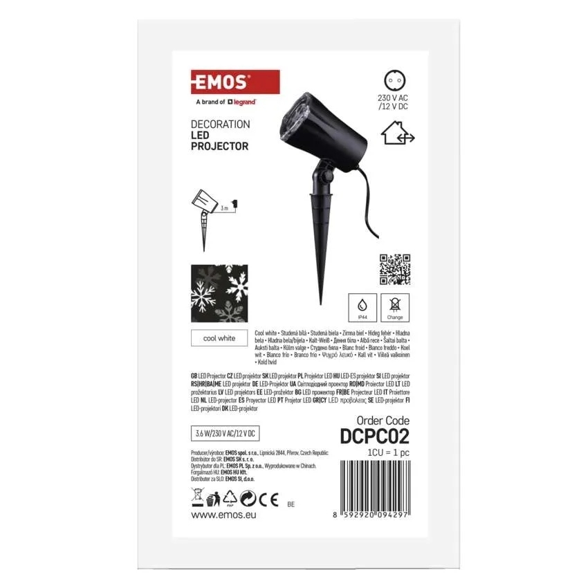 LED vánoční dekorativní projektor EMOS (objednací číslo DCPC02) je projektor se vzorem vločky a barvou světla studená bílá. Je určen pro venkovní i vnitřní použití, technologie svícení je LED a funkce je rotující světlo. Napájení je řešeno síťovým adaptérem, příkon je 3,6 W, vstupní napětí 230 V~ a výstupní napětí 14 V DC, délka přívodu je 3 m. Projektor má krytí IP44, je vyroben z plastu a deklarovaná životnost je 10 000 hodin, časovač ani dálkový ovladač nejsou k dispozici.