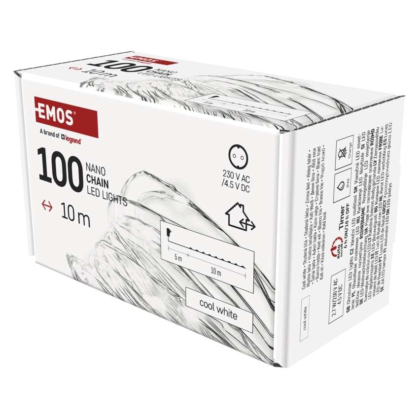 LED vánoční nano řetěz EMOS D3AC01 100LED 10 m stříbrný studená bílá s časovačem