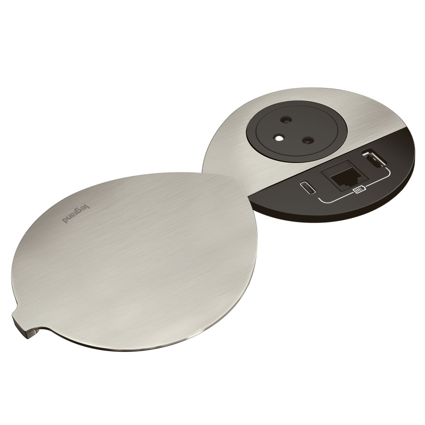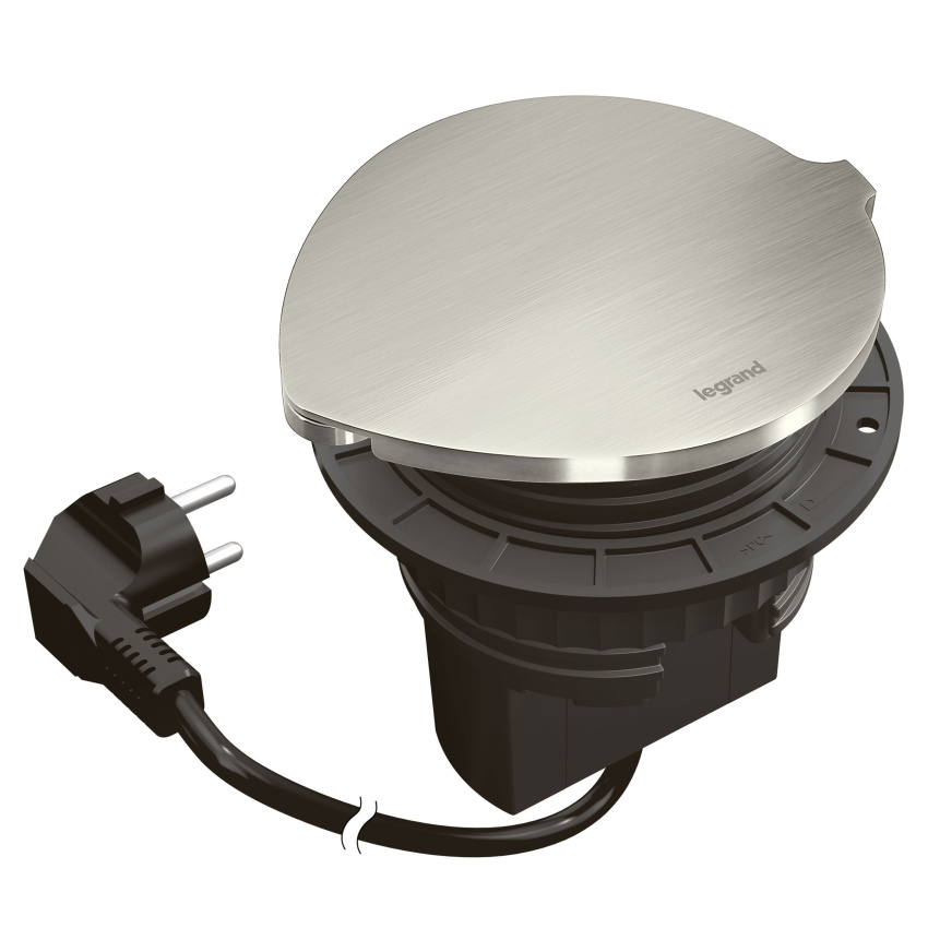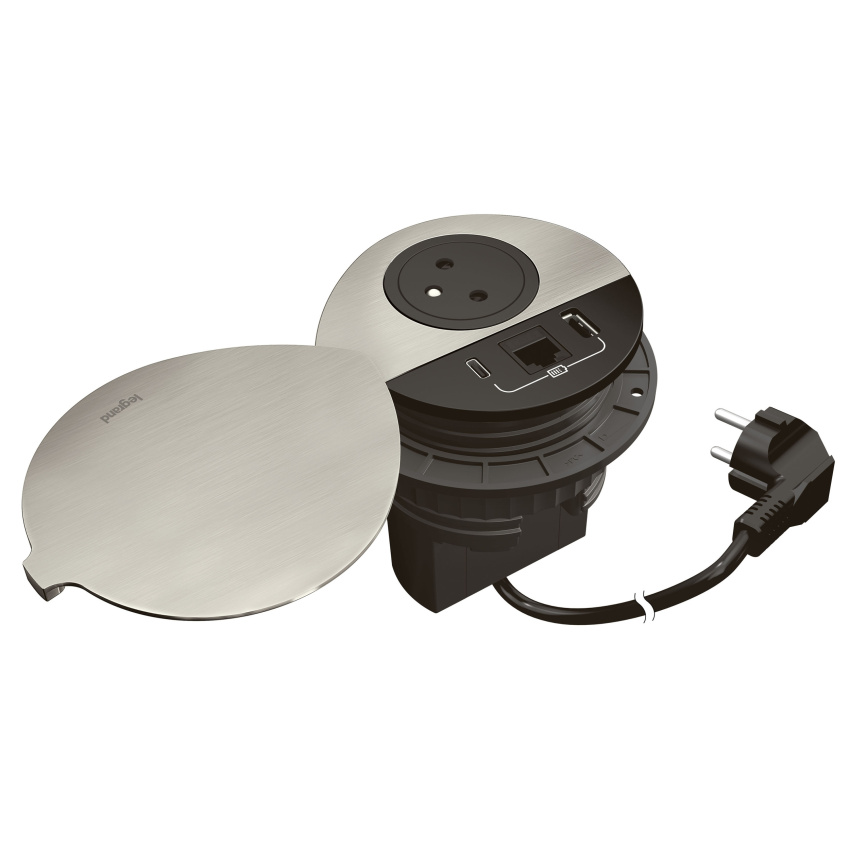 LEGRAND INCARA 654704 ZÁSUVKA ZAPUŠTĚNÁ DISQ 80 2P+T USB A+C RJ45 ČERNÁ S KOVOVÝM KRYTEM 2M KABEL S VIDLICÍ 2P+T