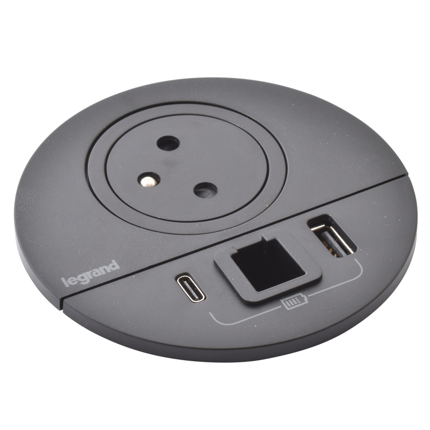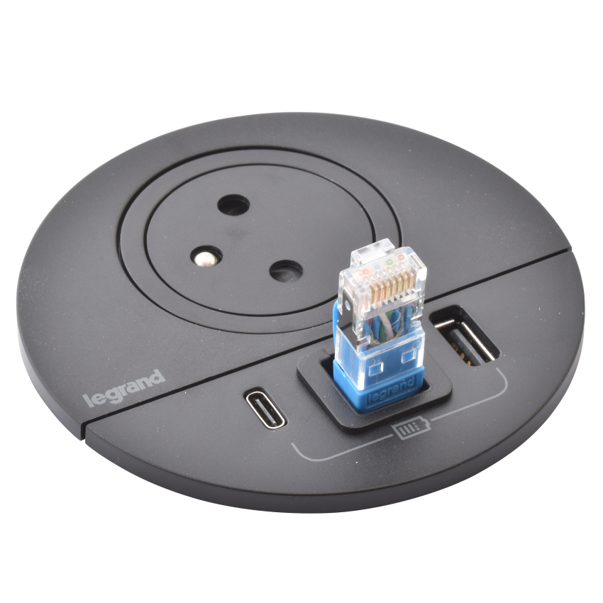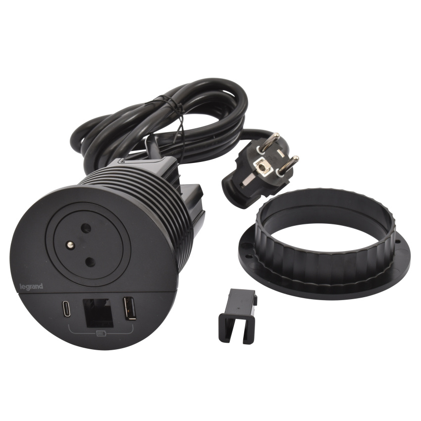 LEGRAND INCARA 654707 ZÁSUVKA ZAPUŠTĚNÁ DISQ 80 2P+T USB A+C ČERNÁ KABELOVÁ VÝVODKA 2M KABEL S VIDLICÍ 2P+T