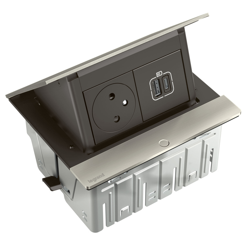 LEGRAND INCARA 654816 KRABICE DO NÁBYTKU POP-UP OSAZENÁ BROUŠENÝ HLINÍK 4M 2P+T USB A+C 15W 2M KABEL S VIDLICÍ 2P+T