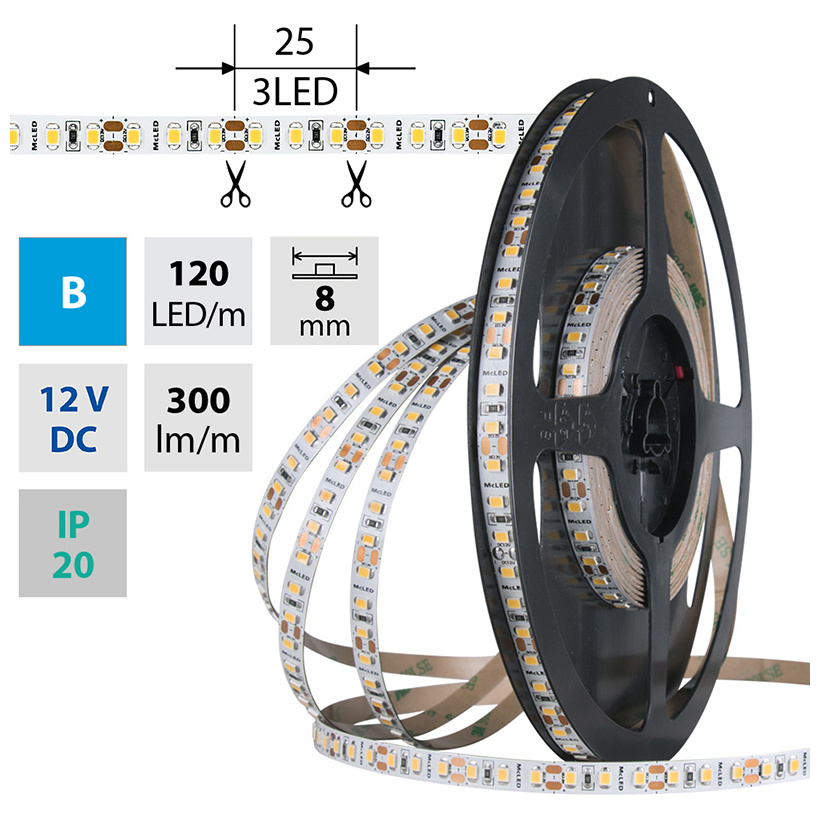 LED pásek SMD2835, modrý B, 9,6 W, 120 LED, 300 lm/m, CRI>90, segment 25 mm, 3 LED/segment, IP20, DC 12V, životnost 54000 h, šíře 8 mm, bílý PCB pásek, max. délka pásku při jednostranném zapojení: 5 m, opatřen samolepící páskou 3M, UV stabilní. Balení 5 m.