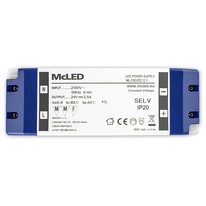 MCLED ZDROJ NAPÁJ. 60W DC24V/2,5A IP20 PLASTOVÉ PROVEDENÍ SE SVORKOVNICÍ ML-732.072.11.1