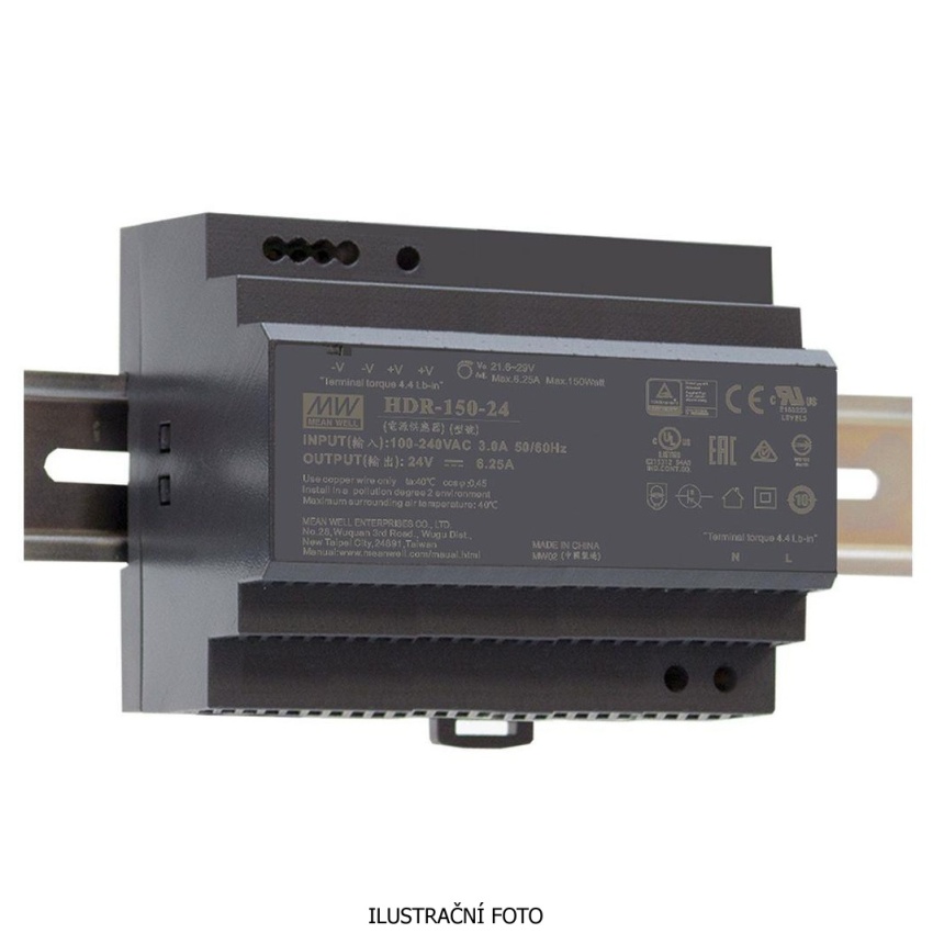 MEANWELL ZDROJ AC/DC NA DIN LIŠTU HDR-150-12 135W VSTUP 85-264V AC, 120-370V DC VÝSTUP 12V 0-11.3A 94680