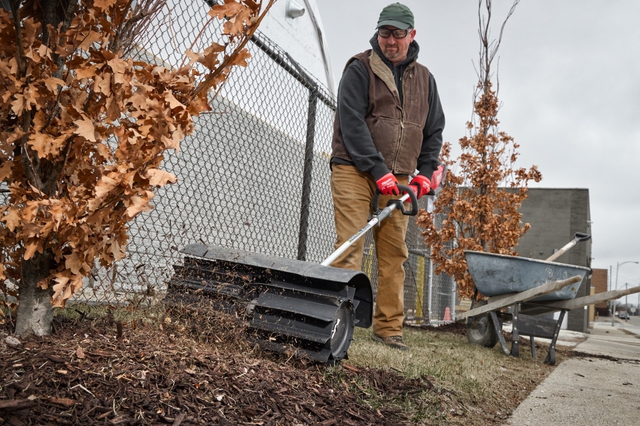 Milwaukee QUIK-LOK™ gumový kartáč s krytem M18 FOPH-RBA je určen k odstraňování kamenů, listí, hlíny, mulče a jiných nečistot z travnatých ploch a tvrdých povrchů.