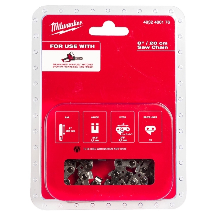 Pilový řetěz Milwaukee, o délce 8 palců (203 mm), je určen pro řetězové pily modelu M18 FHS20.