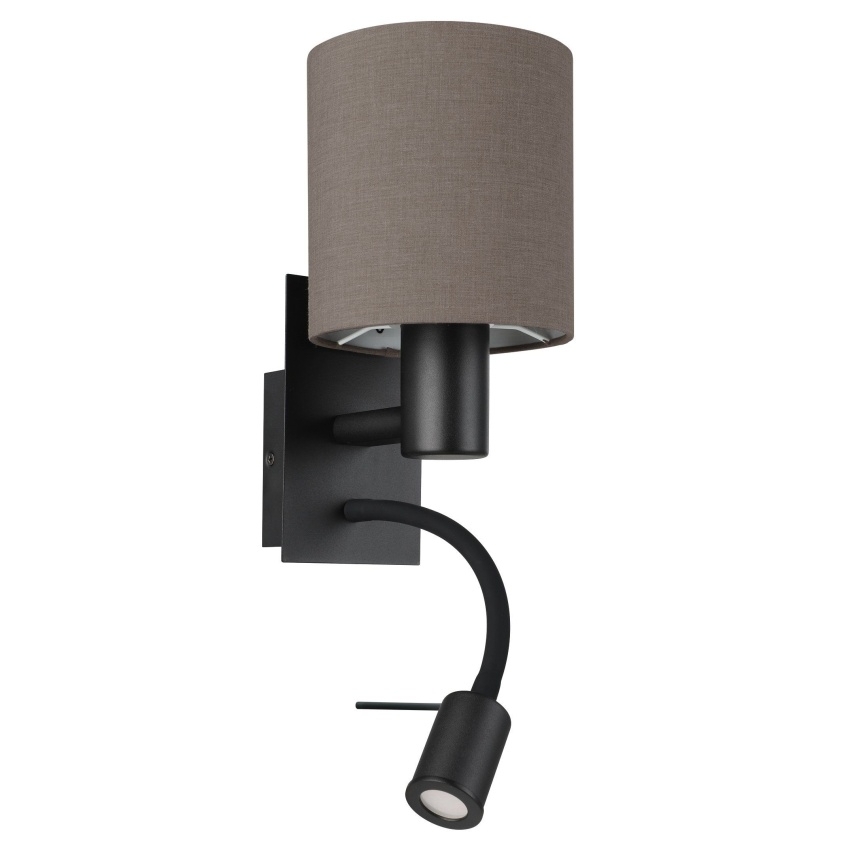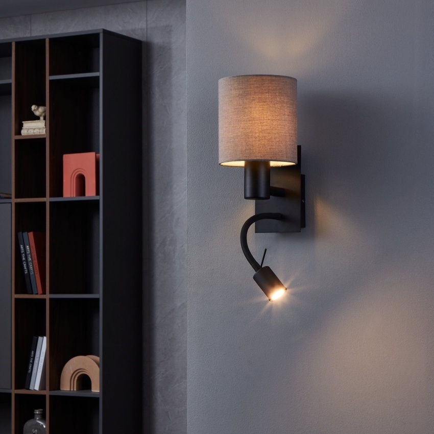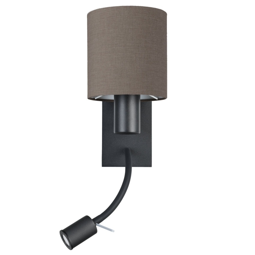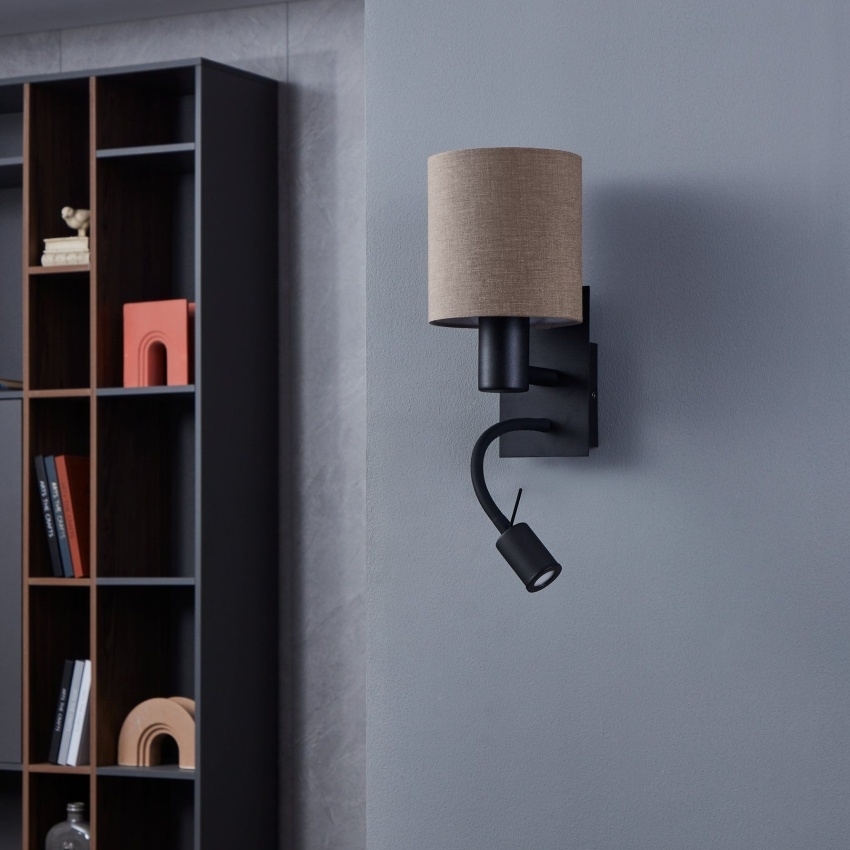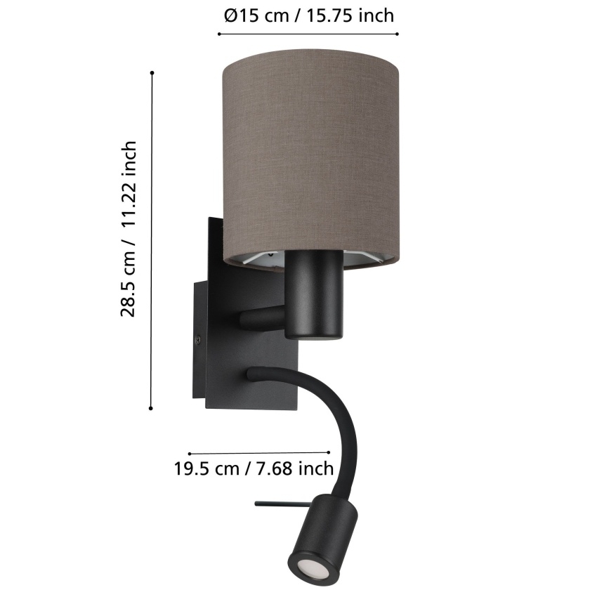 Nástěnné svítidlo EGLO PASTERI v sobě spojuje stylový design a praktické funkce. Tělo svítidla je vyrobeno z černého kovu a doplněno kulatým textilním stínidlem v antracitově hnědé barvě. Součástí svítidla je pohyblivé LED světlo na čtení, které poskytuje příjemné teplé bílé světlo a umožňuje cílené osvětlení. Díky jednoduchému modernímu vzhledu se hodí do ložnice, obývacího pokoje nebo jiných obytných prostor. Ovládání je snadné pomocí kolébkového spínače umístěného přímo na těle lampy. Hlavní světelný zdroj s paticí E27 není součástí balení, takže si můžete vybrat žárovku dle vlastních potřeb.