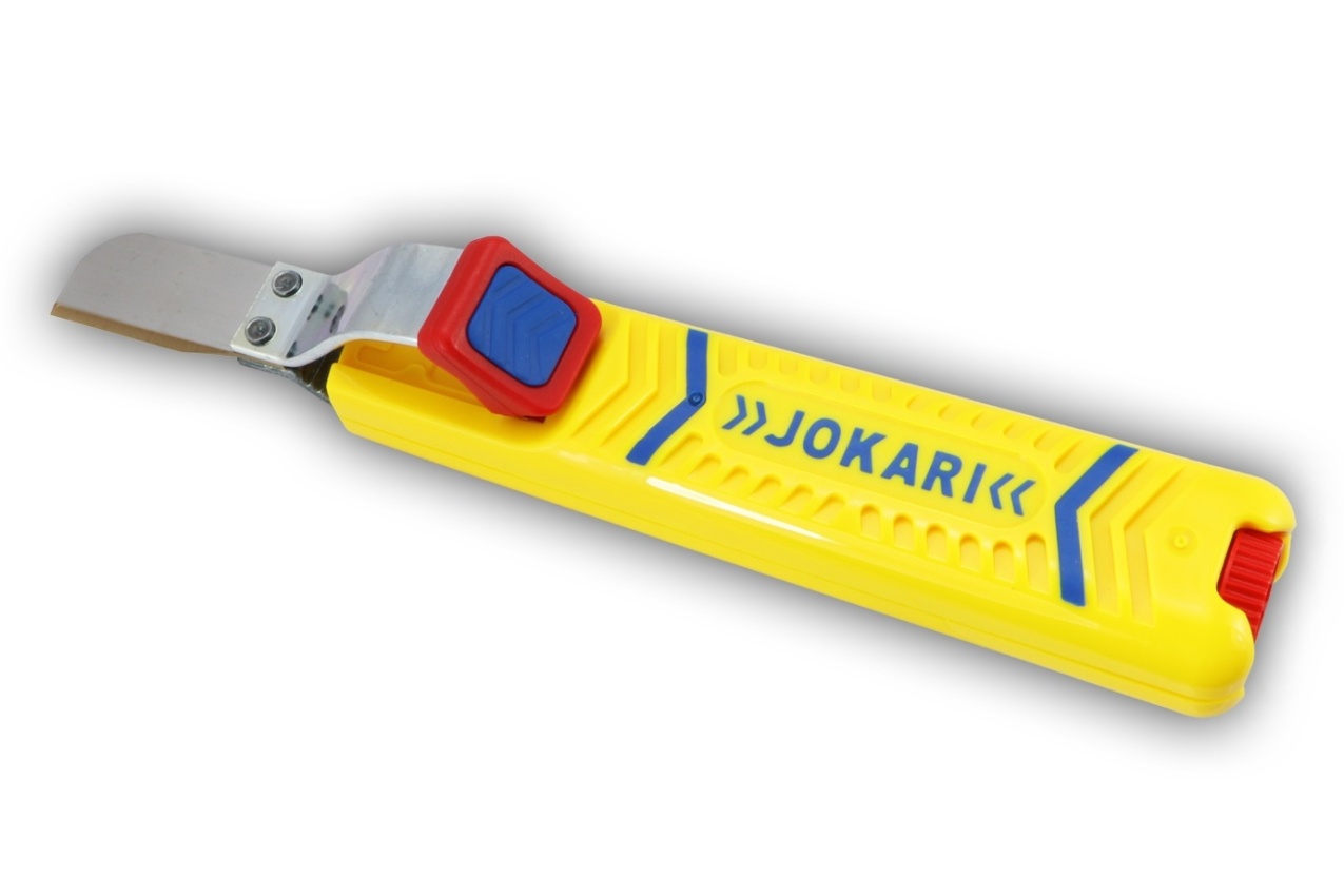 Kabelový nůž Secura 28 G - JOKARI. Milionkrát osvědčený kabelový nůž JOKARI k odpláštění všech běžných kulatých kabelů. Každý kabelový nůž JOKARI má speciální titan-nitridový povlak (TIN) pro vyšší řeznou rychlost, menší opotřebení a větší životnost. Kabelový nůž s přídavným břitem, speciálně broušeným pro párání kruhových a plochých kabelů. Protiskluzové vedení třmenu. Odizolovávací nástroj pro průměr kabelu 8,0 – 28,0mm2. Náhradní vnitřní párací nůž s TIN povlakem je umístěn v držadle.