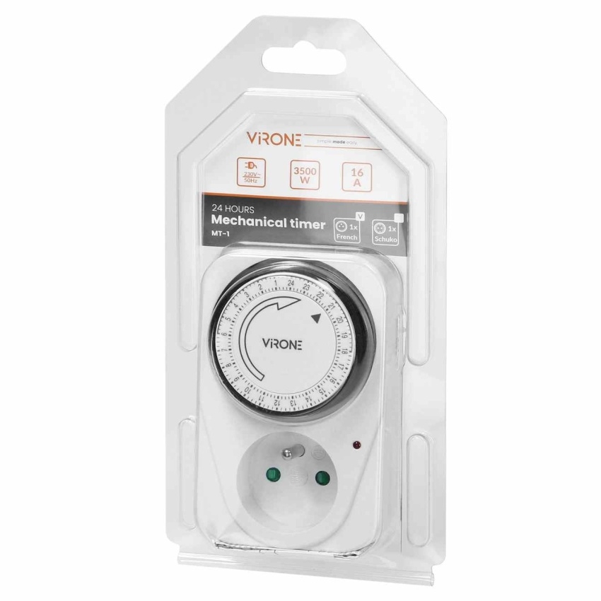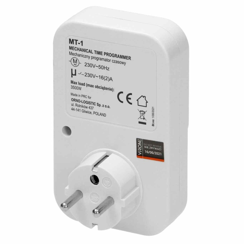 Mechanický zásuvkový časovač ORNO MT-1 s maximálním výkonem 3500 W od výrobce VIRONE.