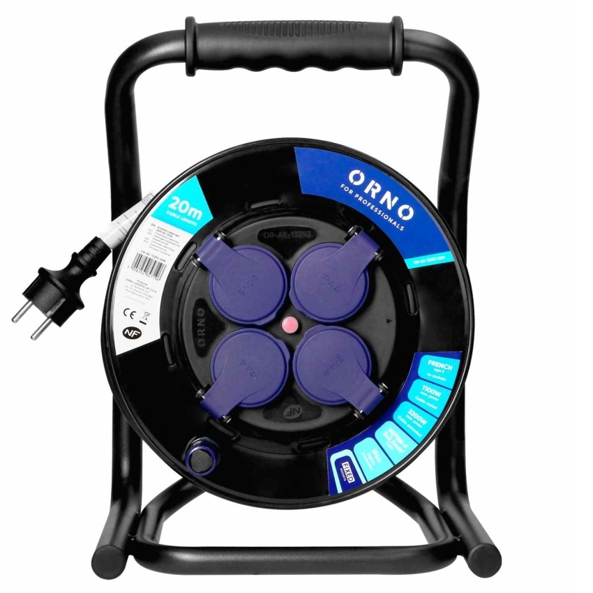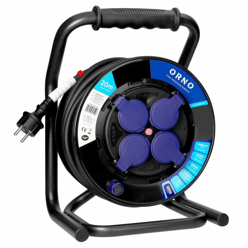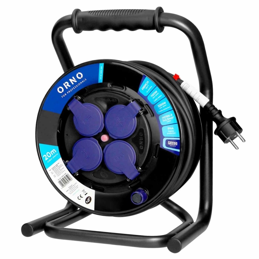 Navíjecí gumový prodlužovací kabel ORNO H07RN-F 3×2,5 mm? s délkou 20 m a čtyřmi zásuvkami, krytí IP44.
