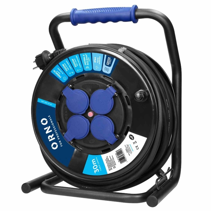ORNO navíjecí prodlužovací kabel je vybaven gumovým kabelem H07RN-F o průřezu 3×2,5 mm2 a délkou 30 metrů. Kabel disponuje čtyřmi zásuvkami a pevným středem, který zajišťuje stabilní uchycení. Díky krytí IP44 je vhodný pro použití v prostředí s vyšší vlhkostí a prachem.