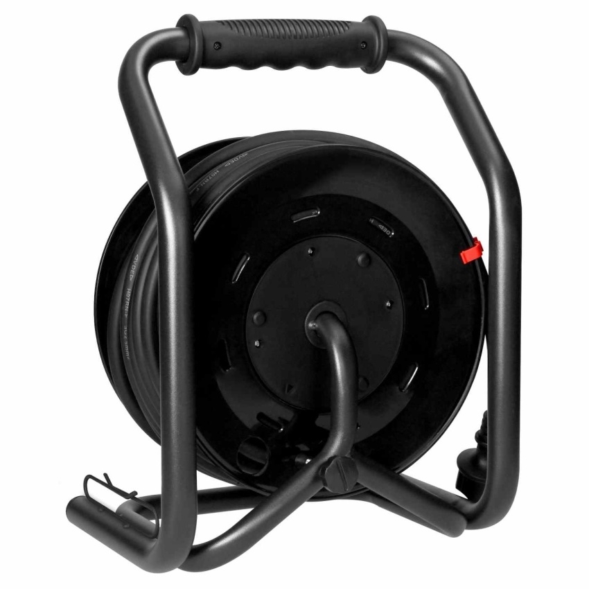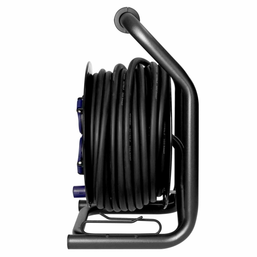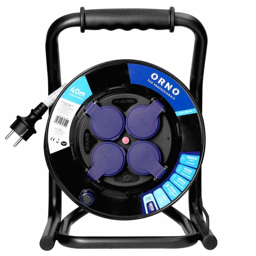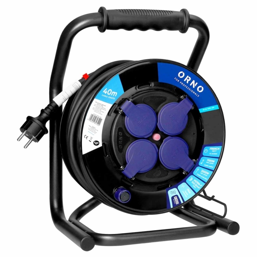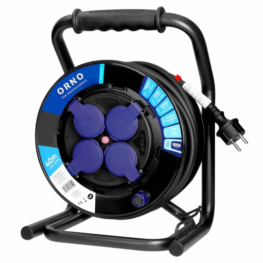 Navíjecí prodlužovací kabel ORNO H07RN-F s průřezem 3×2,5 mm? a délkou 40 m. Obsahuje 4 zásuvky a pevný střed s krytím IP44.