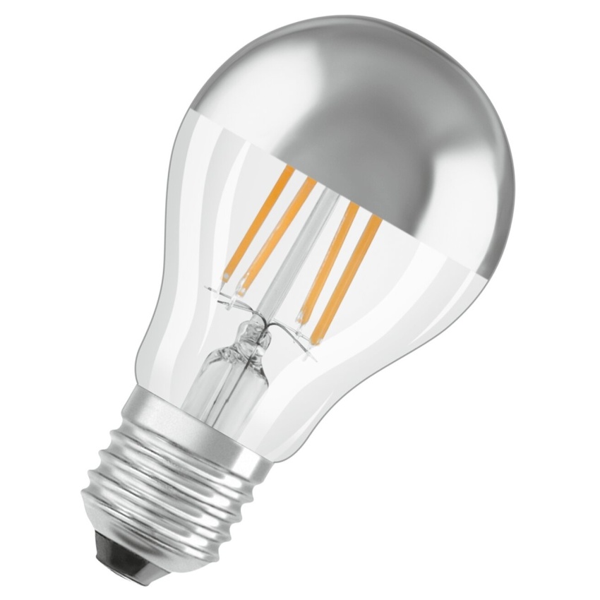LED světelné zdroje, tvar klasické baňky se zrcadlovým vrchlíkem. Vlastnosti produktu: Povlak koruny žárovky: zlatý nebo stříbrný. Světelný zdroj je vyroben ze skla. Dobrá kvalita světla, index podání barev Ra: ≥ 80; konstantní barevnost. Výhody produktu: Dlouhá životnost dosahující až 15 000 h. Nízká spotřeba energie. Snadná výměna světelného zdroje díky kompaktnímu designu. Okamžitě 100 % světla, bez náběhu. Světelné zdroje s inovativní „filamentovou" technologií LED. Druh použití: Dokonalé pro ozdobné instalace. Osvětlení zrcadel. Domácí použití. Všeobecné osvětlení. Pouze pro vnitřní použití, nevhodné pro venkovní použití.