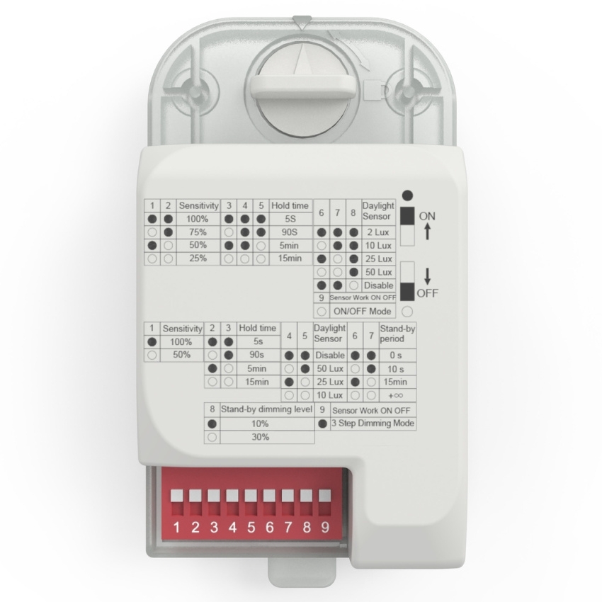 - Nastavení pomocí DIP: dosah (do 4 m), prah denního světla 10–50 lx, doba svícení 5 s až 15 min, úroveň/perioda DIM*