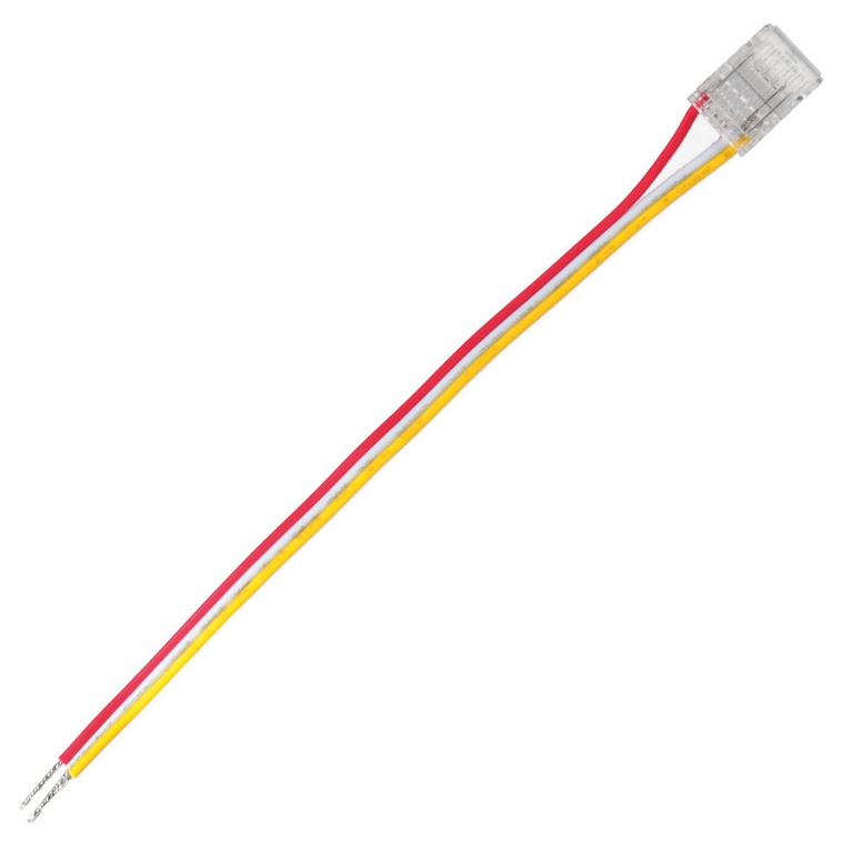 Praktický konektor určený pro připojení CCT COB LED pásků o šířce 10 mm. Díky 3pinovému systému a přívodnímu kabelu o délce 150 mm umožňuje snadné zapojení bez pájení. Vodiče AWG22 (0,35 mm2) jsou barevně označeny (červená/bílá/žlutá) pro přehledné zapojení. Konektor je zhotoven z transparentního plastu, je opakovaně použitelný a podporuje proudové zatížení až 3,5 A. Ideální doplněk pro flexibilní instalace CCT LED pásků v interiéru.