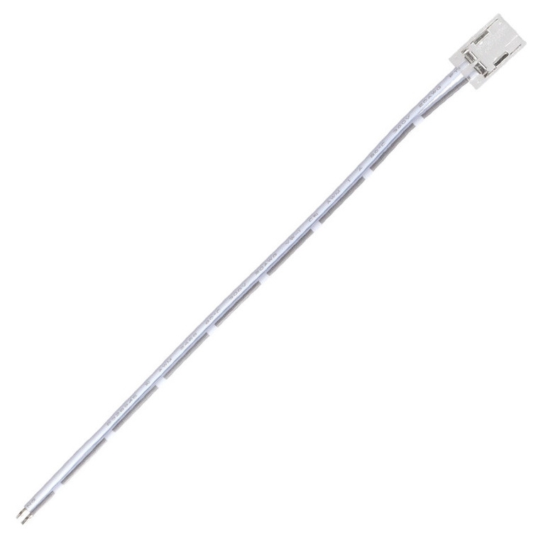 Připojovací konektor jednobarevných LED pásků šíře 8 mm, 2 piny. Konektor využijete ke snadnému propojení LED pásků s řízením, nebo napájecími zdroji s výstupní svorkovnicí. Konektor lze použít na LED pásky s jakýmkoli počtem LED/m, pásek se zasune do konektoru a konektor zafixuje kleštěmi. Doporučujeme pro max. proud 3,5 A, pro větší proudy je třeba vodiče k LED pásku připájet. Rozměry plastové části: 9,6 (š) x 15,6 (d) x 3,3 (v) mm, celková délka cca 160 mm. Kabel: barva bílá, velikost AWG20/0,5 mm2.