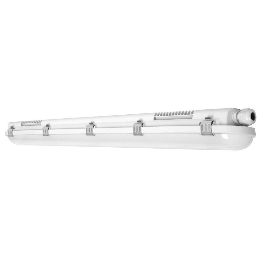 Prachotěsná svítidla, klasický tvar. Vlastnosti produktu: Vysoká světelná účinnost: až 120 lm/W. Stupeň krytí: IP65. Vyzařovací úhel: 115°. Možnost kabelového propojení. Polykarbonátové pouzdro. Výhody produktu: Rovnoměrně rozložené světlo. Úspora energie až 50 % (ve srovnání s osvětlením se zářivkami). Snadná instalace, pro zapojení není třeba žádného nářadí. 3letá záruka. Druh použití: Ideální pro průmyslová a skladovací zařízení. Parkoviště a podchody. Garáže. Dílny, montážní linky. Výbava / příslušenství: Včetně svorek z nerezové oceli s bezpečnostními šrouby. Včetně upevňovacího příslušenství (sada pro zavěšení, sada ochrany před odcizením).