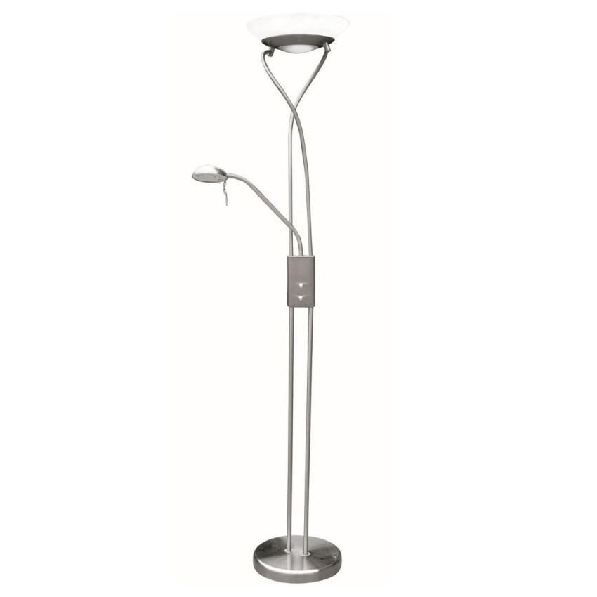 Stojací lampa s vysokým jasem a čtecím ramenem, která má samostatný vypínač a funkci stmívače. Má kovovou konstrukci v barvě saténového chromu s bílými stínítky.