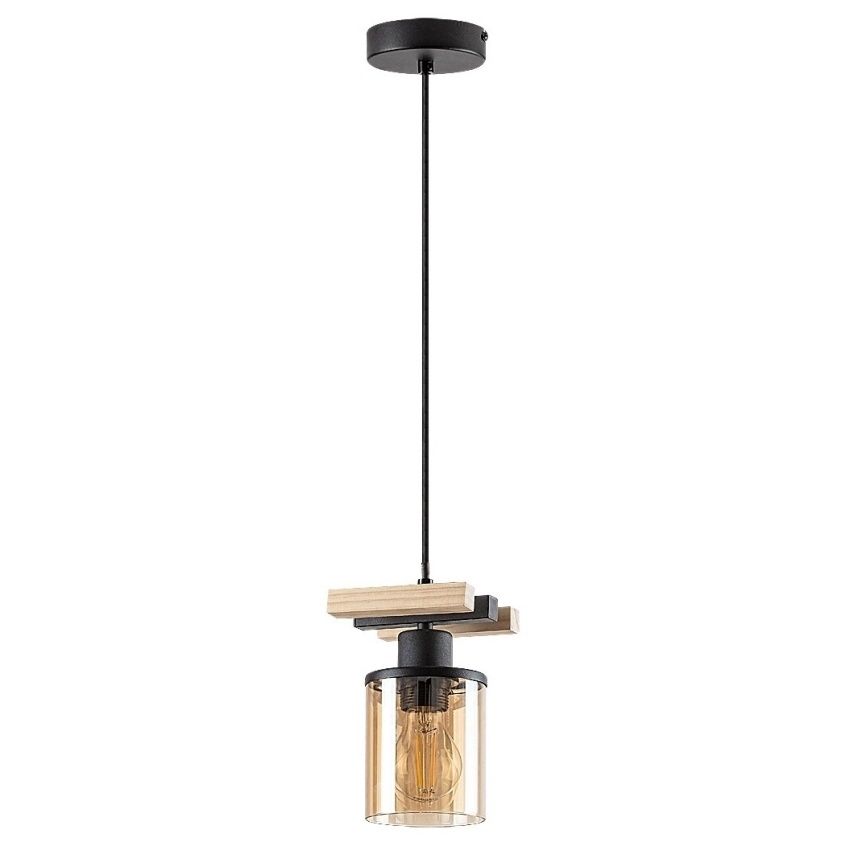 Elegantní kombinace černého kovu, dřevěných prvků a válcového jantarového skleněného stínítka vytváří teplou a příjemnou atmosféru. Svítidlo je určeno pro jednu žárovku s paticí E27 a maximálním příkonem 25W. Díky průhlednému stínítku doporučujeme použít dekorativní žárovku s teplým bílým světlem, která zvýrazní design svítidla. Produkt je dodáván bez světelného zdroje a je vhodný i do místností s nižší světlou výškou díky variabilní délce zavěšení.