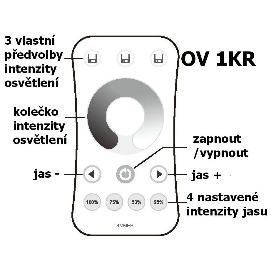 Dálkový ovladač dimLED OVS 1KR je bezdrátový radiofrekvenční ovládací systém, jednoho ovladače a několik přijímačů. S jedním ovladačem lze ovládat 1 zónu, která se může skládat z několika přijímačů.