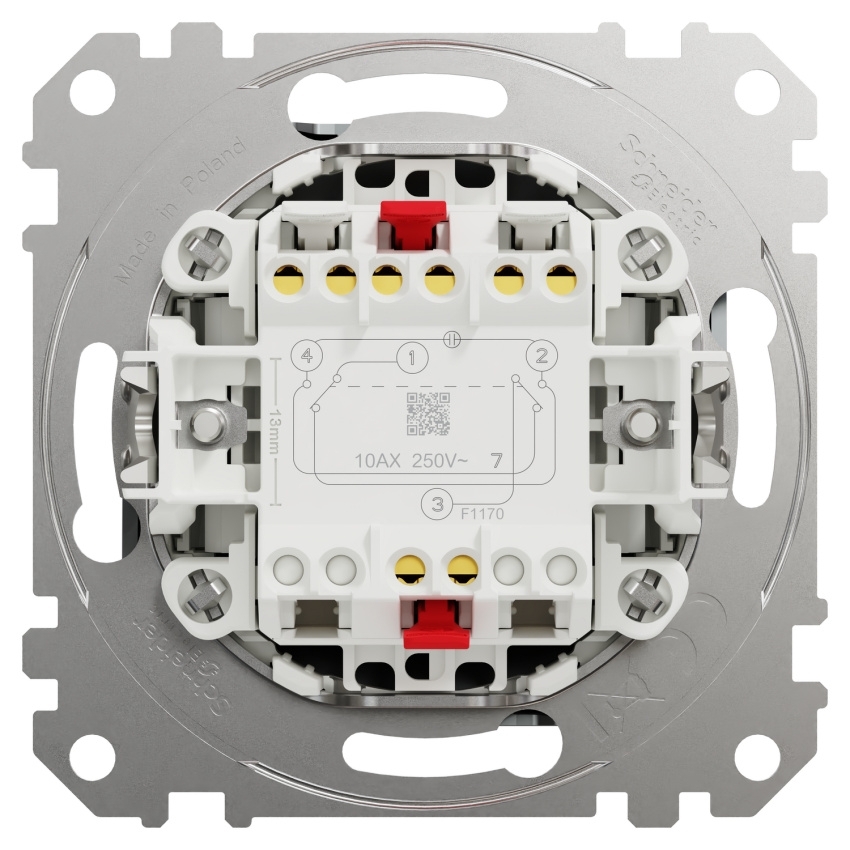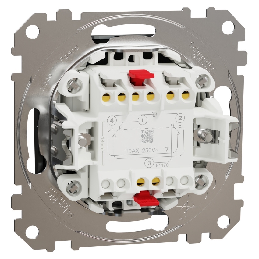 Křížový přepínač Schneider Electric Sedna Design Elements SDD172107U je určen pro zapuštěnou montáž a je vyroben v elektromechanickém provedení. Disponuje bezšroubovými svorkami, které umožňují snadné připojení vodičů a podporují rychlou montáž. Tělo přístroje je z odolného polykarbonátu a má lesklou povrchovou úpravu v odstínu kartáčovaného titanu. Spínač pracuje při jmenovitém proudu 10 AX a napětí 250 V AC s frekvencí 50 Hz. Rozměry 73 × 73 × 37 mm zajišťují kompatibilitu se standardními instalačními krabicemi. Stupeň krytí IP20 odpovídá použití v běžných interiérových podmínkách.