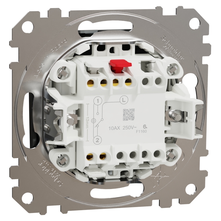 Přepínač Schneider Electric Sedna Design Elements SDD172106U je elektromechanický střídavý přepínač řazení 6 s jednou kolébkou, určený pro ovládání světelných okruhů v síti AC 230/250 V. Jmenovitý proud přístroje je 10 AX při frekvenci 50 Hz a je vhodný například pro ovládání jedné lampy s integrovaným předřadníkem do 100 W, celkový rozsah výkonu je až 2300 W. Přístroj je konstruován pro zapuštěnou montáž, upevnění je řešeno pomocí šroubů a rozpěrných spon v rozsahu roztažení 52–67 mm a používá bezšroubové svorky pro vodiče o průřezu 1,5–2,5 mm2. Čelní díl z polykarbonátu (PC) má povrchovou úpravu Brushed titanium v leštěném titanovém provedení, rozměry viditelné části jsou 73 × 73 mm, celková hloubka přístroje 37 mm, krytí je IP20 a mechanická odolnost IK02, přičemž spínač splňuje požadavky normy IEC 60669-1 a nese označení CE.
